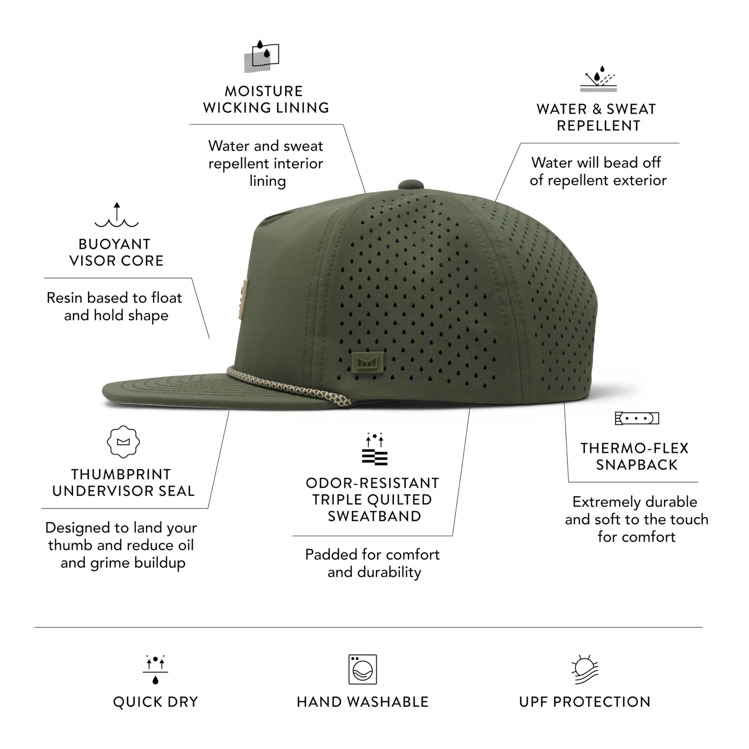 PERFORMANCE SNAPBACK HAT: Exterior crown has hydrophobic crown panels, laser-perforated side & rear panels for breathability, and custom soft touch snapback closure. Honeycomb Visor is designed for weight reduction and packability