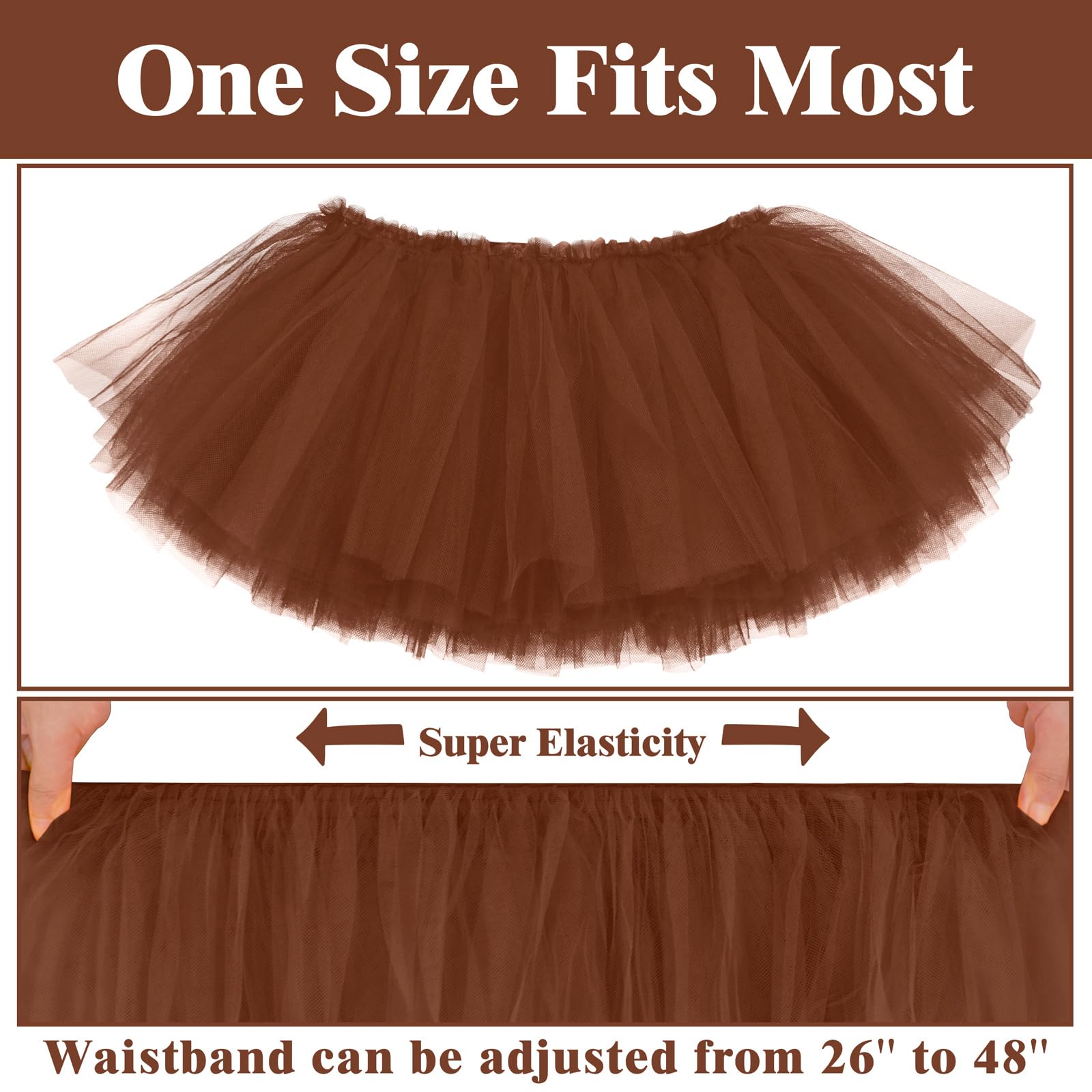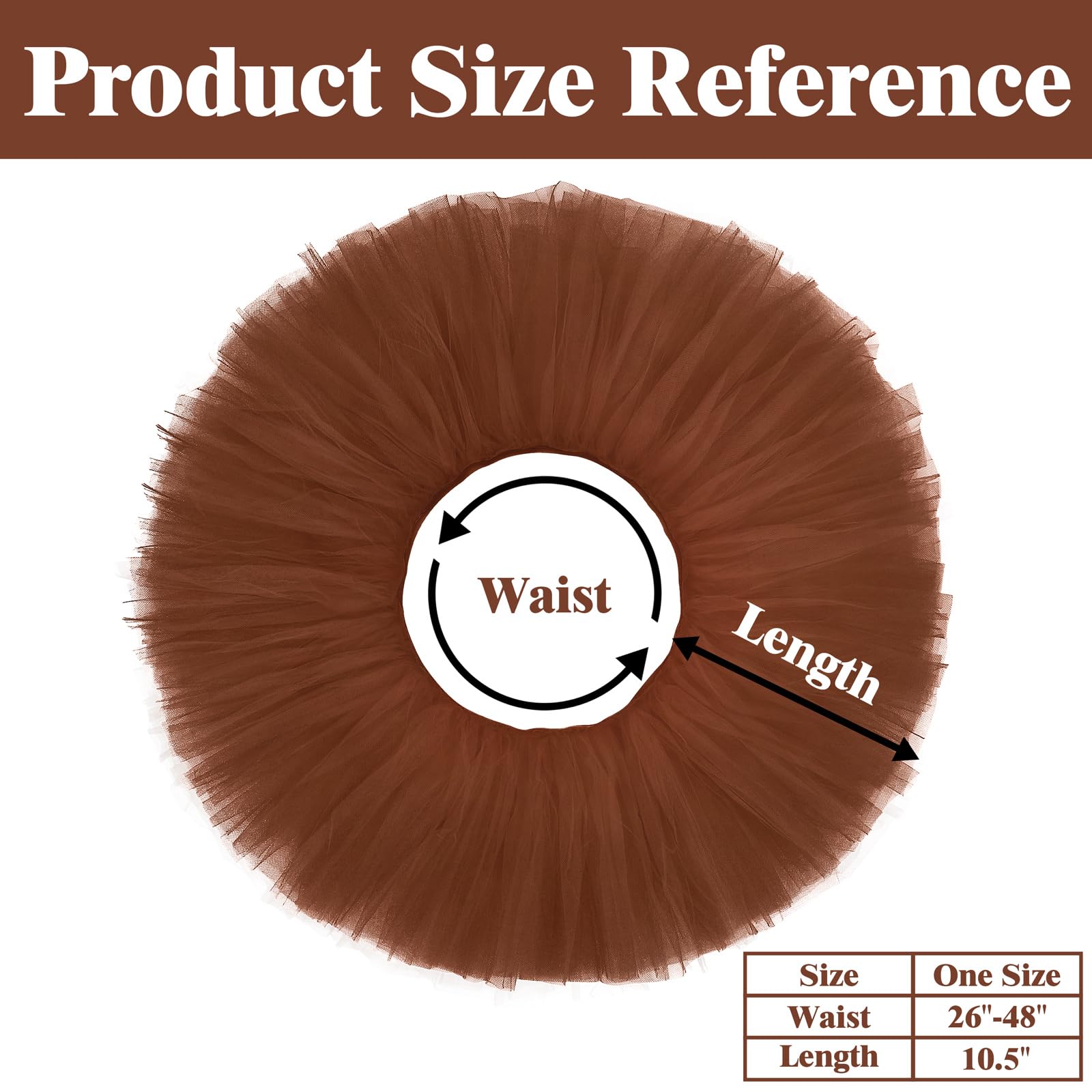 SIZE INFORMATION: One Size fits for most. The adult tutu skirts for women measure about 10 inches in length. And our tutus are designed with comfortable and stretchy waistband, which can be adjusted approximately from 26" to 48" in width. The tutu for women is not only durable, but also very easy to slip-on or off.