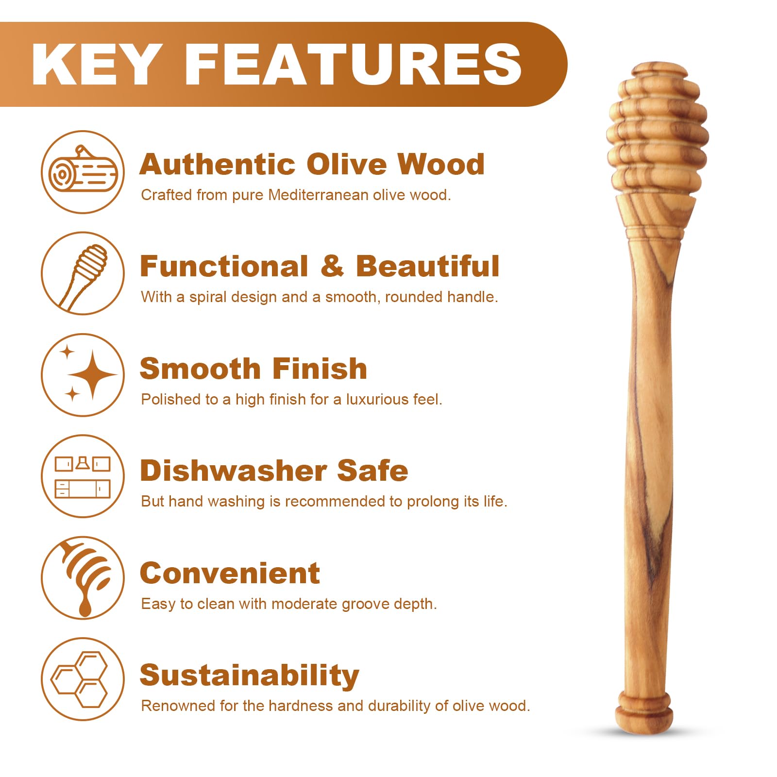 Traditional wooden honey dippers are handcrafted using natural olive wood, known for its beautiful and unique grain, and renowned for its hardness and durability.