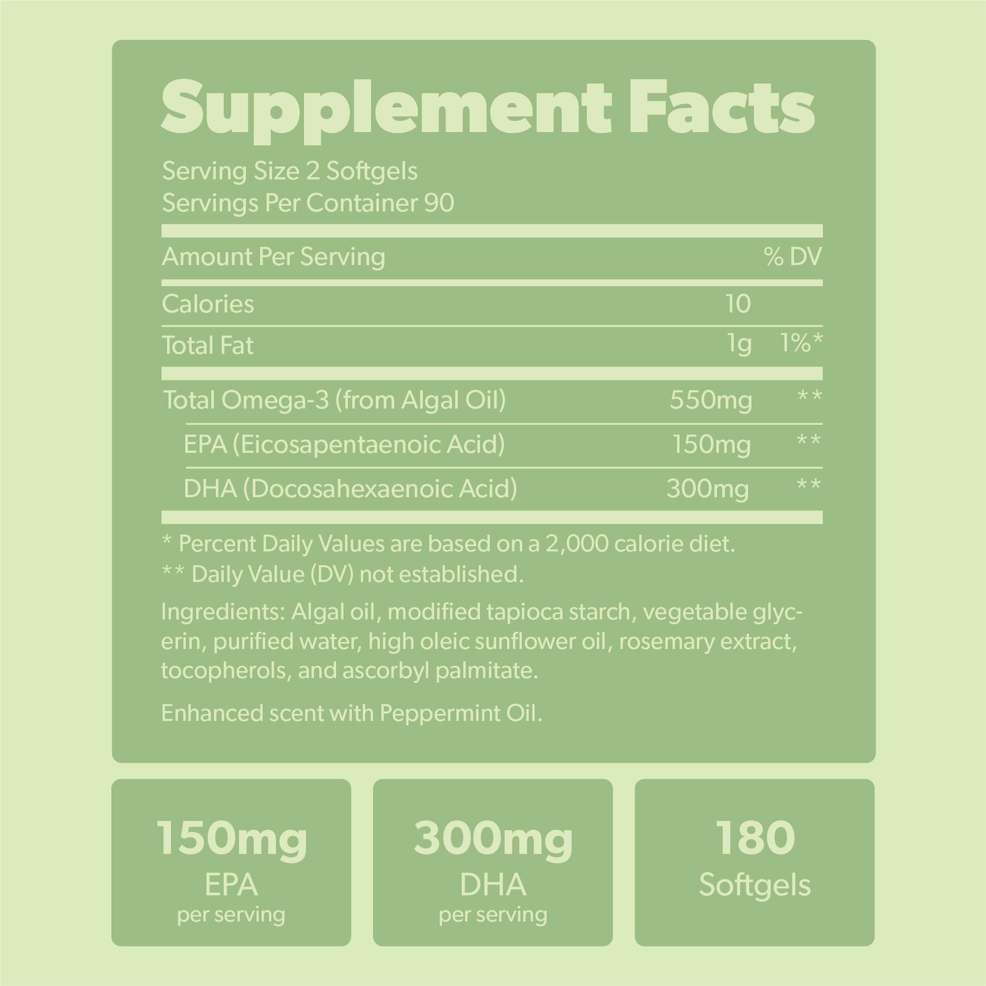 BIOAVAILABLE DHA AND EPA - Our Algae Omega 3 contains a total of 550mg of Omega-3s, 300mg DHA, and 150mg EPA per serving. Other plant oils, such as flaxseed oil, don’t contain DHA or EPA. DHA And EPA are naturally occurring in algae oil.