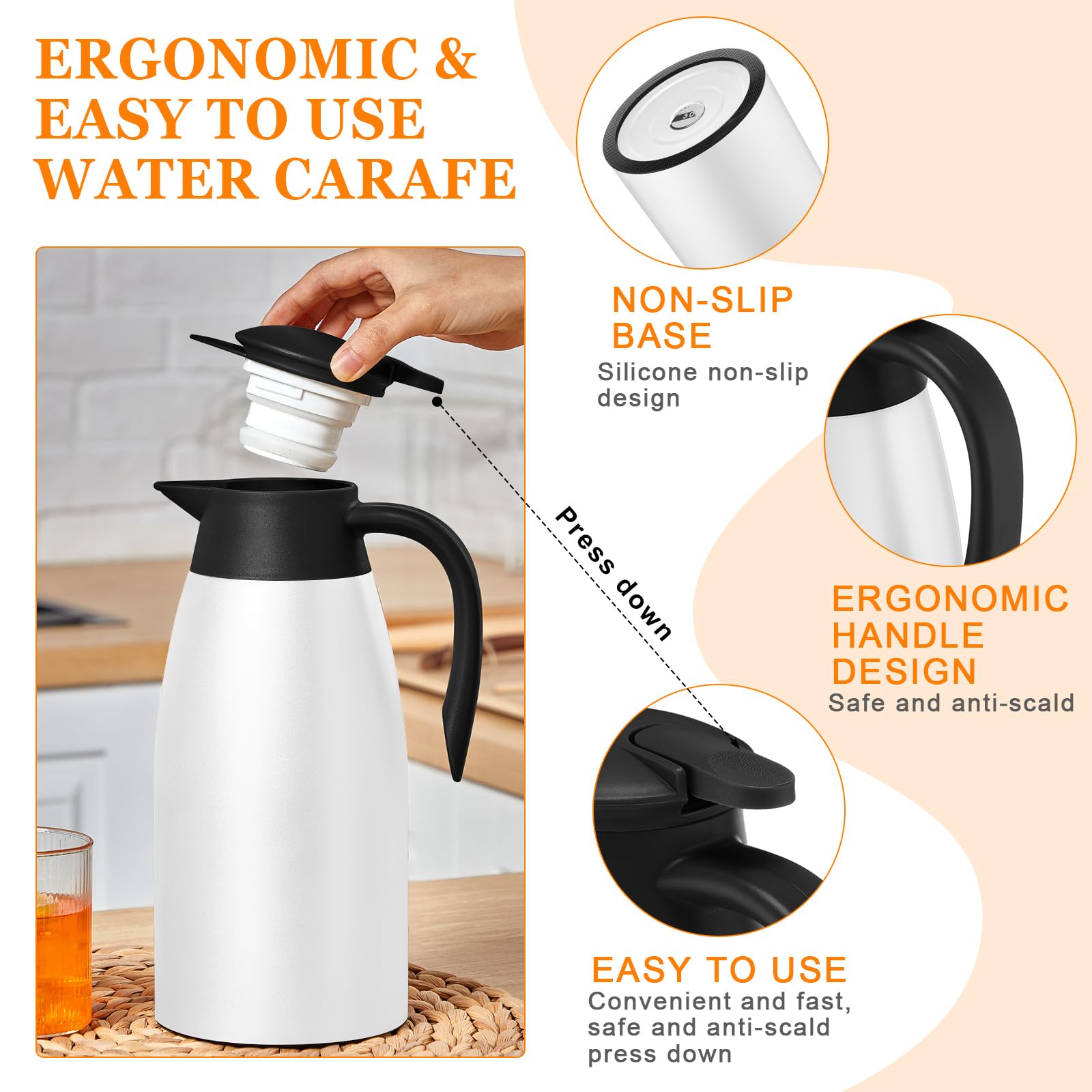Proper Capacity: the vacuum insulated thermal coffee carafe measures about 68 oz in capacity, ideal size for holding tea, coffee, milk, water, juices, and other cold or hot drinks; With a nonslip silicone base, it can keep stable on your table or countertop