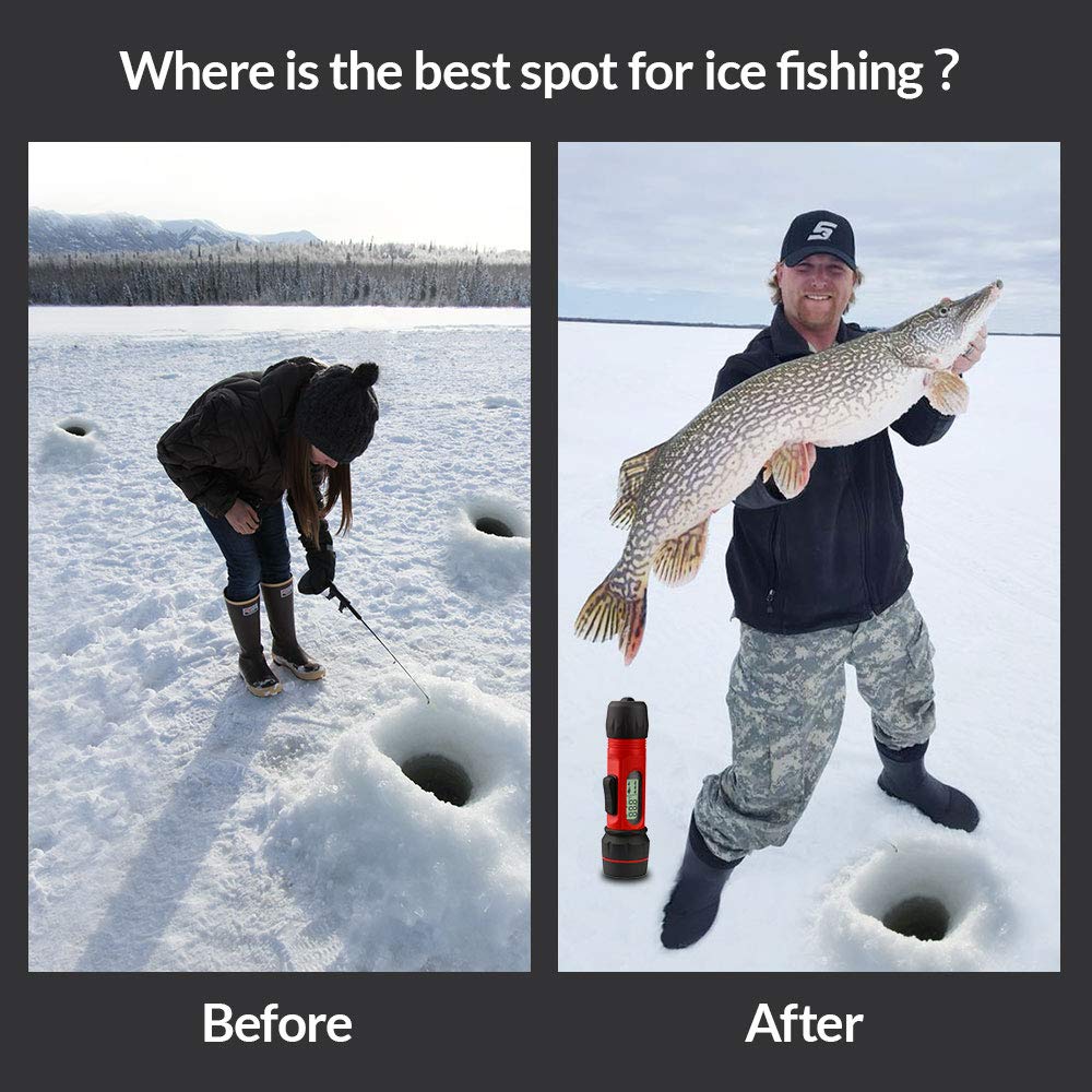 Fishes and Contour Readout:The ice fish finder portable detects and displays water depth, fish group,fish size, temperature. The depth data will be updated four times per second at a depth of 2.5 to 300 feet (0.8 to 90 meters)