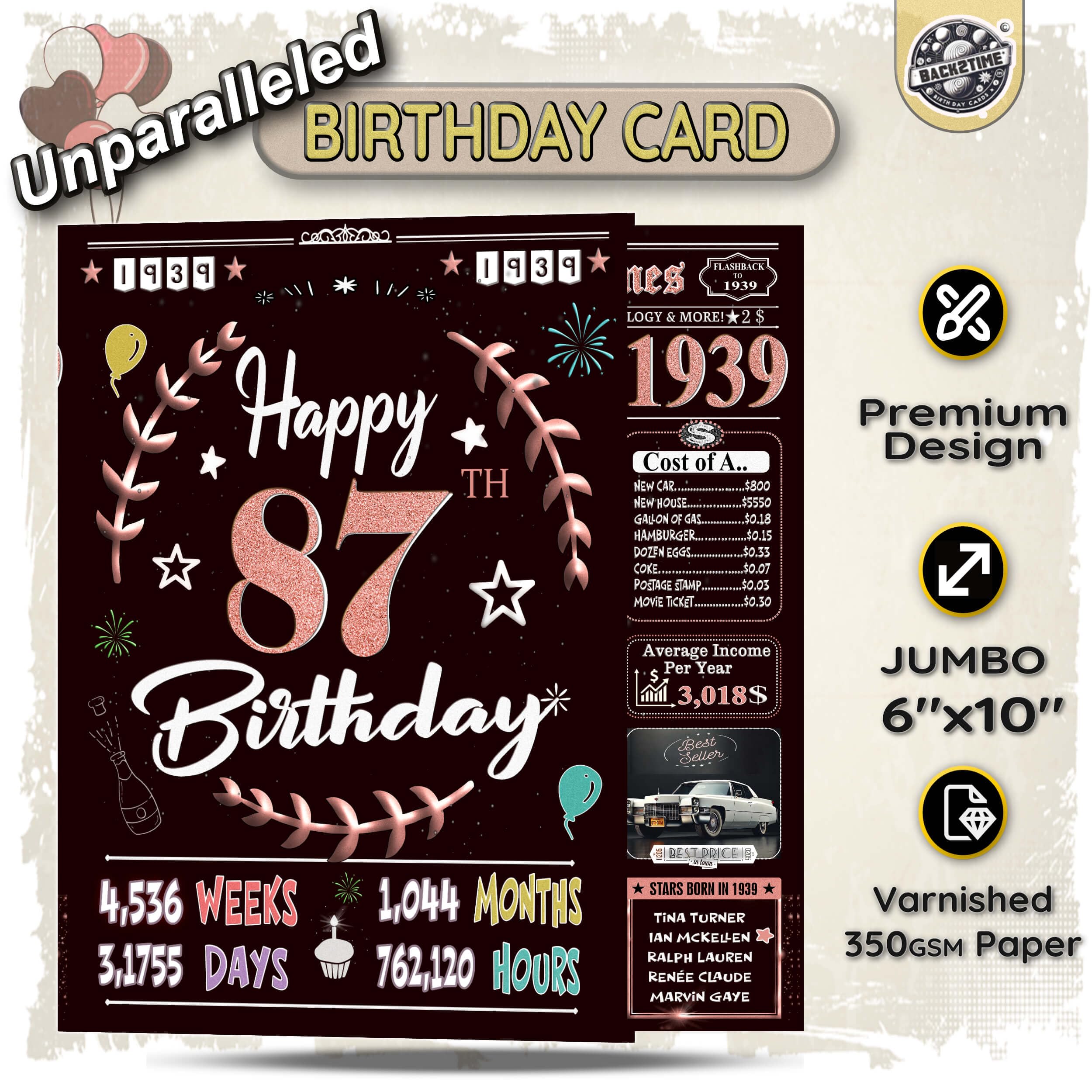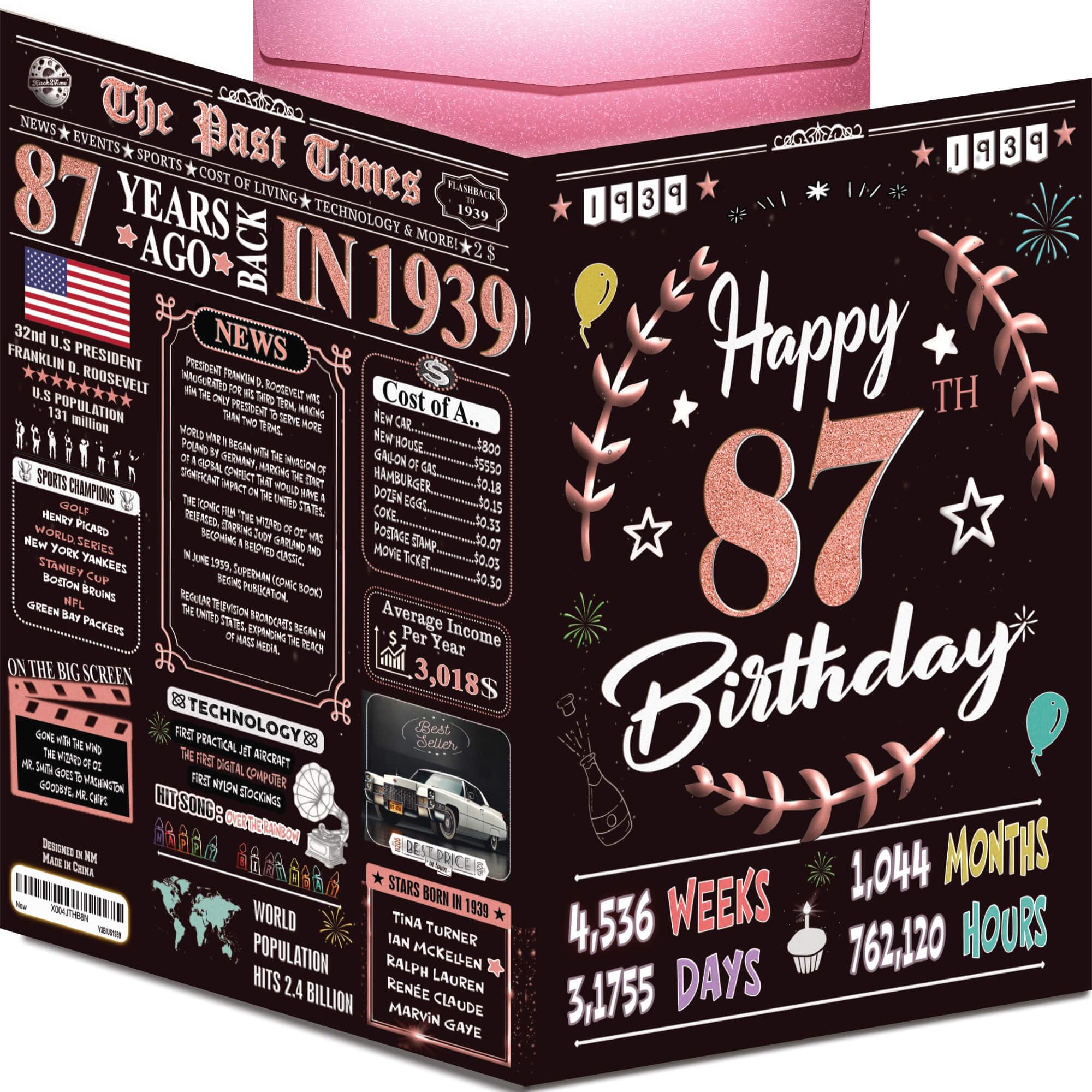 π 87TH BIRTHDAY CARD BACK IN 1939 π Celebrate birthday with this premium rose gold design. Perfect for women, You are looking for a card for sister, wife, girl, cousin, friend β€οΈ. Spread happiness and create unforgettable memories! Ideal for Gifts, 87 Decorations. Happy Birthday Cards for Women, Happy Birthday Card for Her, 87 years old Birthday Decorations with elegant for teen girl young woman female bestie grandma nana stepmom auntie cousin friend sorority sister