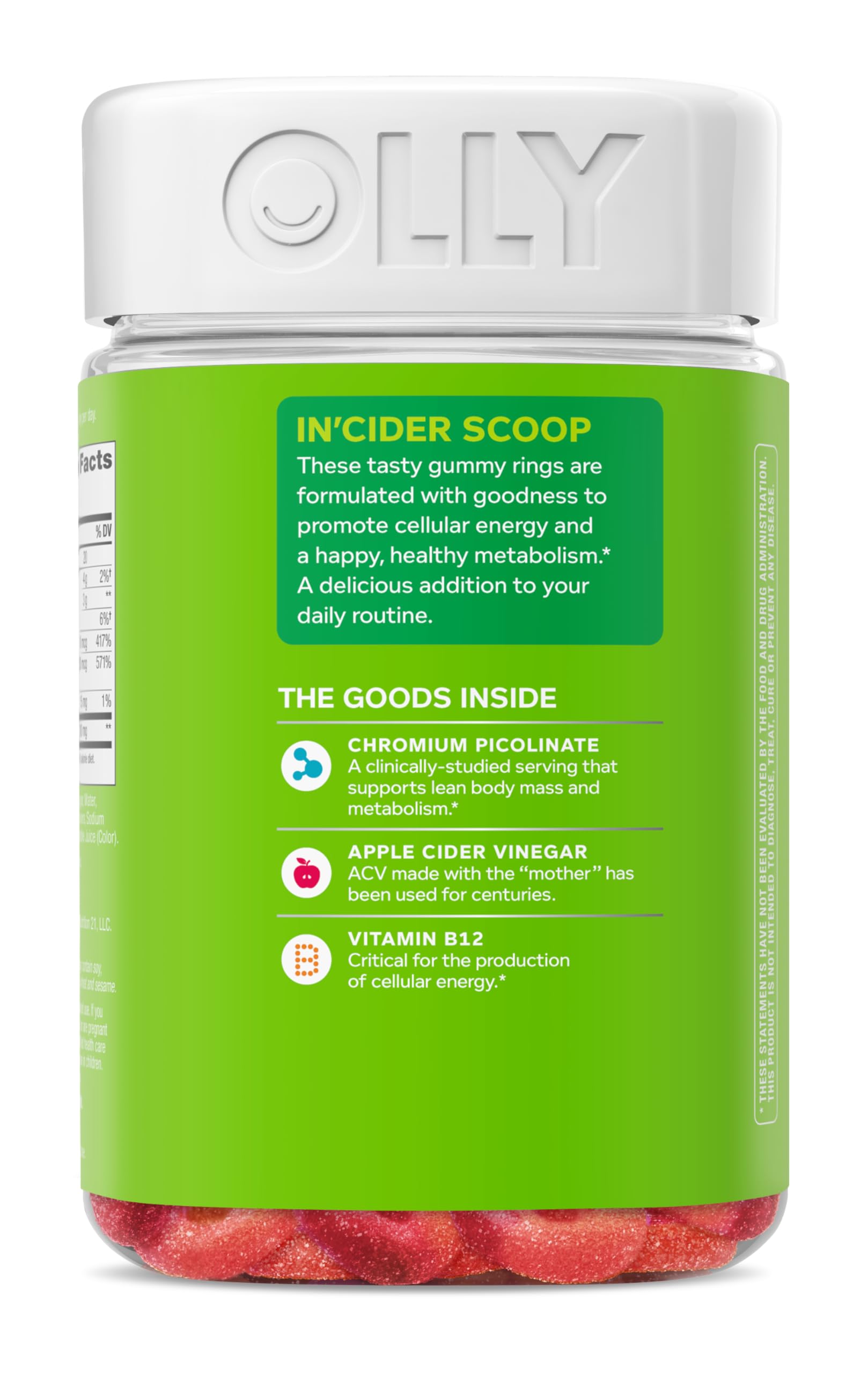 For a healthy metabolism, here's the in'cider scoop. These tasty gummy rings are formulated with goodness to promote cellular energy and a happy, healthy metabolism.* A delicious addition to your daily routine. These totally tasty gummy rings are expertly blended with a clinically studied dose of Chromium Picolinate to support lean body mass‡ and a healthy metabolism. Vitamin B12 is critical for the production of cellular energy. Our Apple Cider Vinegar is made with the "mother," which has been used at home for centuries. ‡With a healthy lifestyle, including exercise. Take one gummy ring daily, chew thoroughly before swallowing. These Snappy Apple flavored gummies are a crisp apple flavor with other natural flavors. OLLY Metabolism Gummy Rings are delightfully tasty, scientifically formulated and are gluten free with no synthetic colors or flavors. *These statements have not been evaluated by the Food and Drug Administration. This product is not intended to diagnose, treat, cure or prevent any disease.