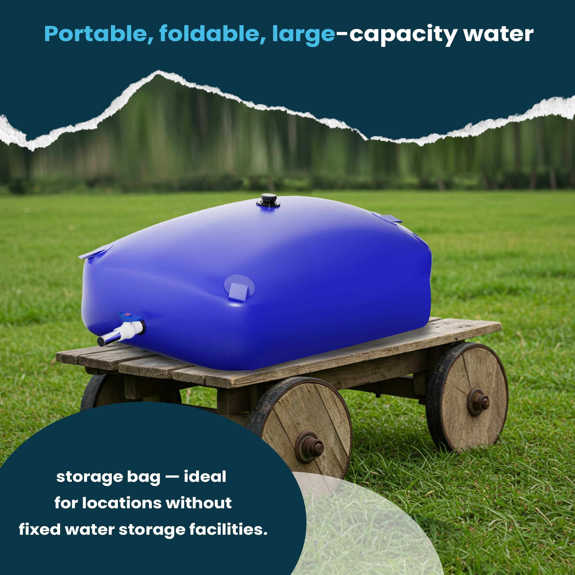 【Convenient and Practical】The large-capacity water storage bladder container is designed with a faucet and 4 portable pull tabs, when you need to use water, just open the water outlet valve. As a non-potable water storage and rainwater recycling collector, it is suitable for drought, fire prevention, emergency water, outdoor agricultural irrigation, etc. It is practical!