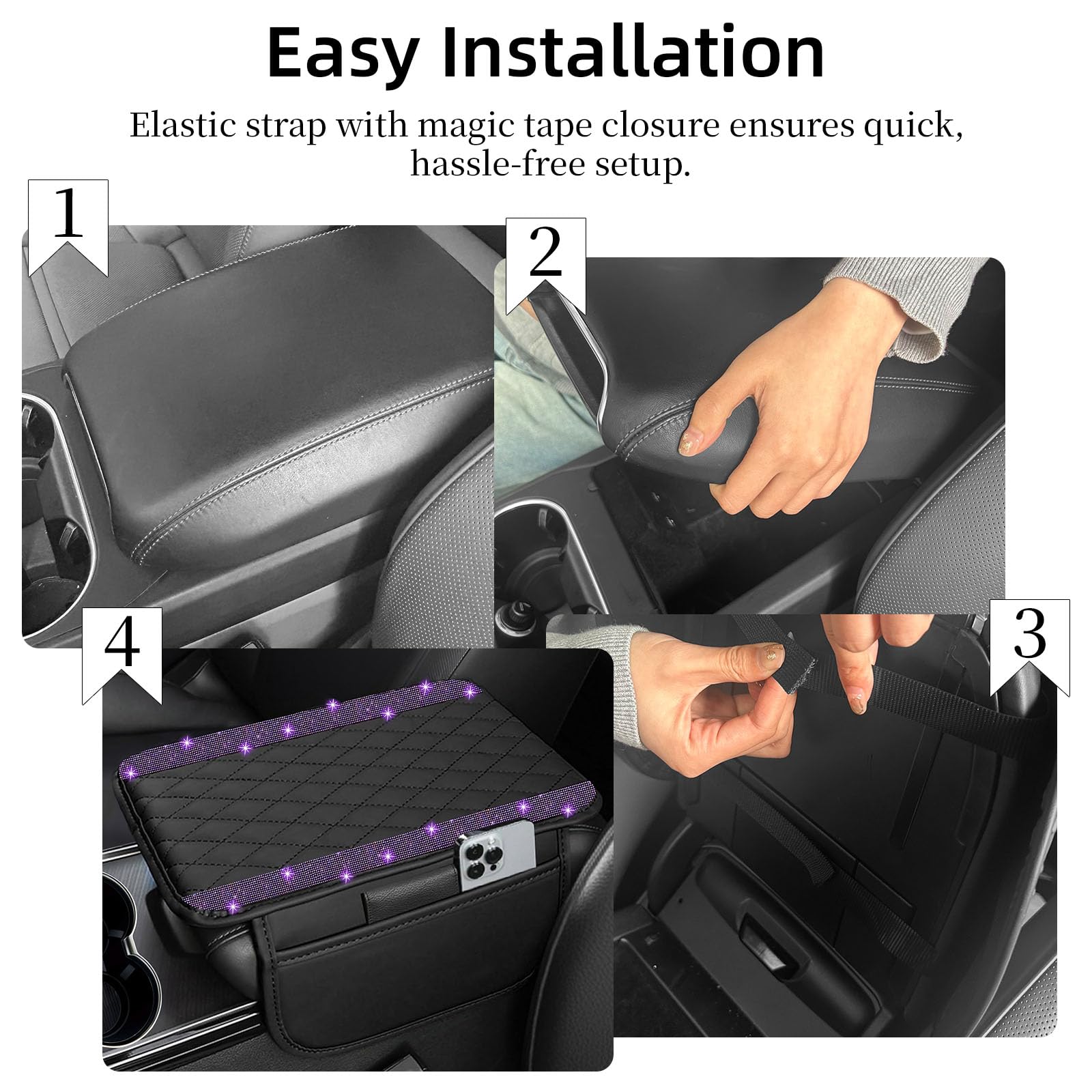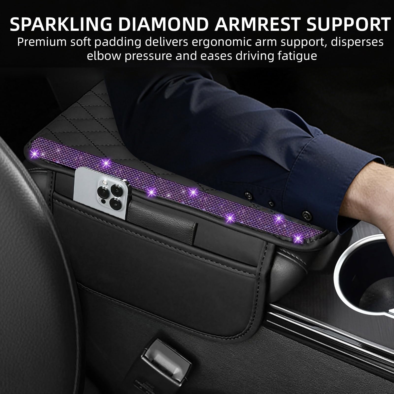 🛡️【Premium Leather & Protective Function】Made of high-quality microfiber leather and durable rhinestones, this car armrest cushion protector safeguards your original armrest from scratches, stains, wear and tear, and pet claws. It preserves the look of your car's interior while providing a soft, comfortable surface for your arm.