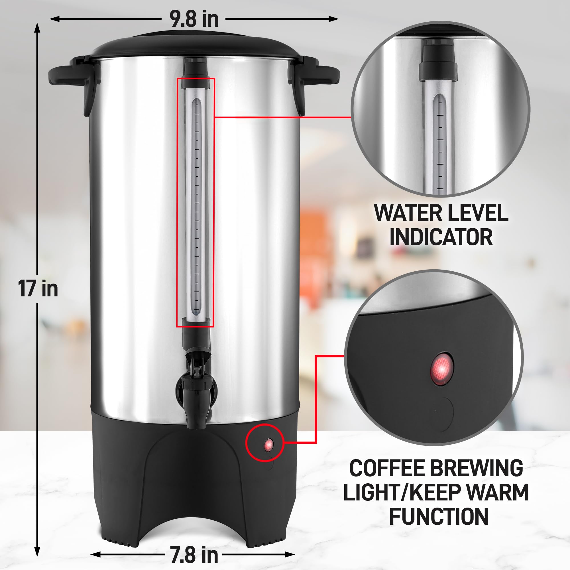 HEAVY-DUTY DESIGN: Our 45 cup coffee maker commercial is constructed with double-wall insulator with a 0.41mm thick 430 stainless steel outer layer and a 0.41mm thick 304 stainless steel inner layer that is both engineered in retaining the heat longer than single wall models. This large coffee maker 45 cup has cool to touch handles which makes our coffee urn 45 cup easy to carry and a simple twist-lock lid that helps lessen accidental spillage.