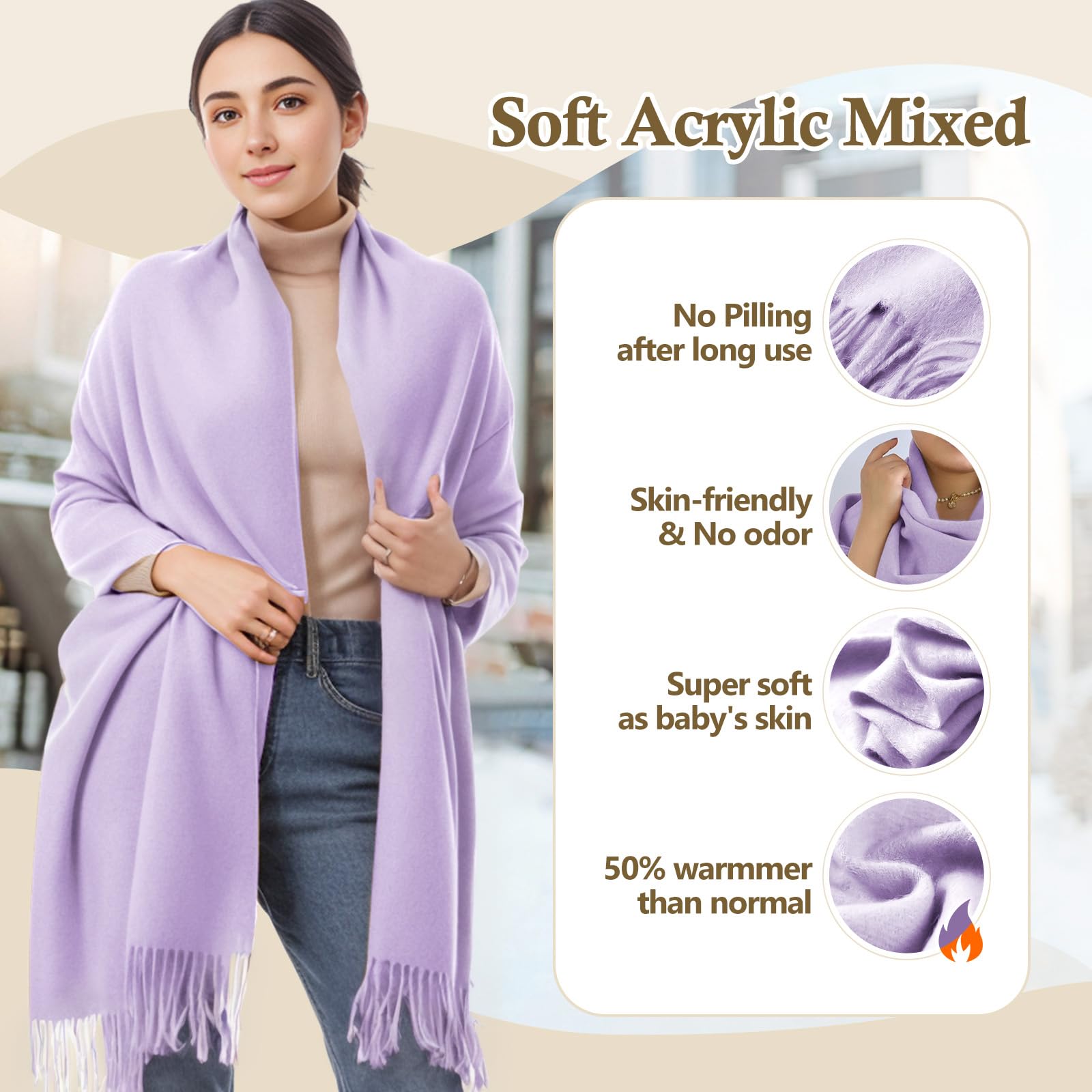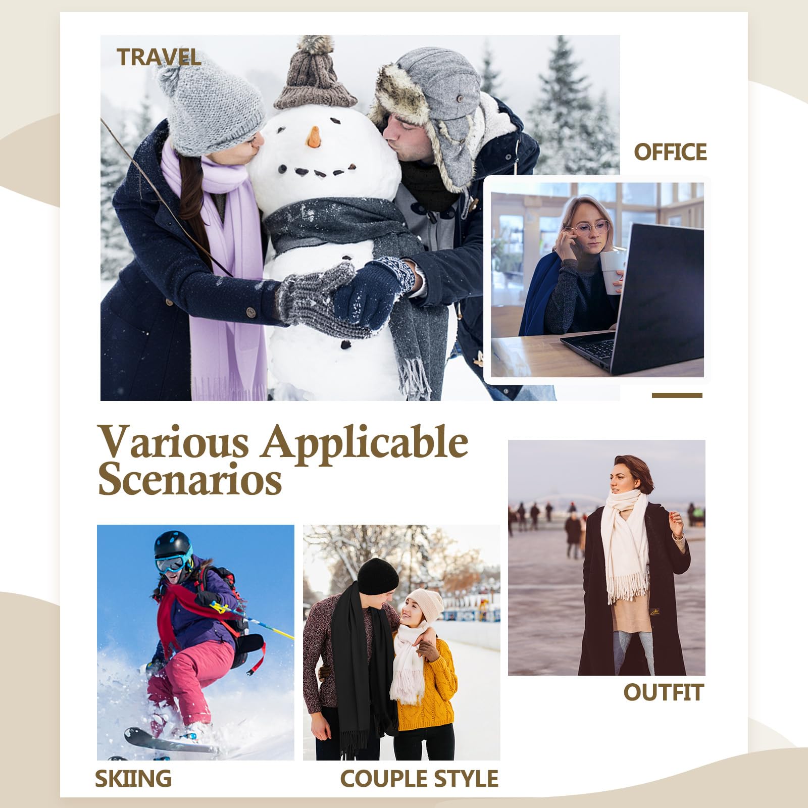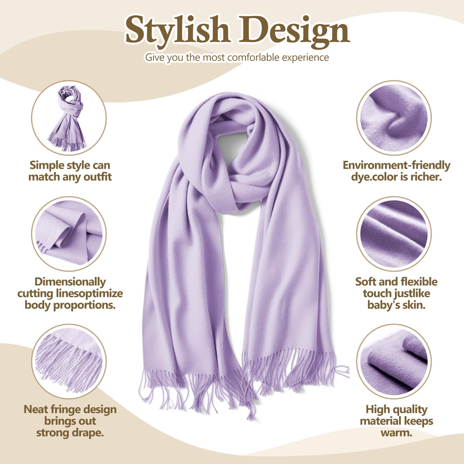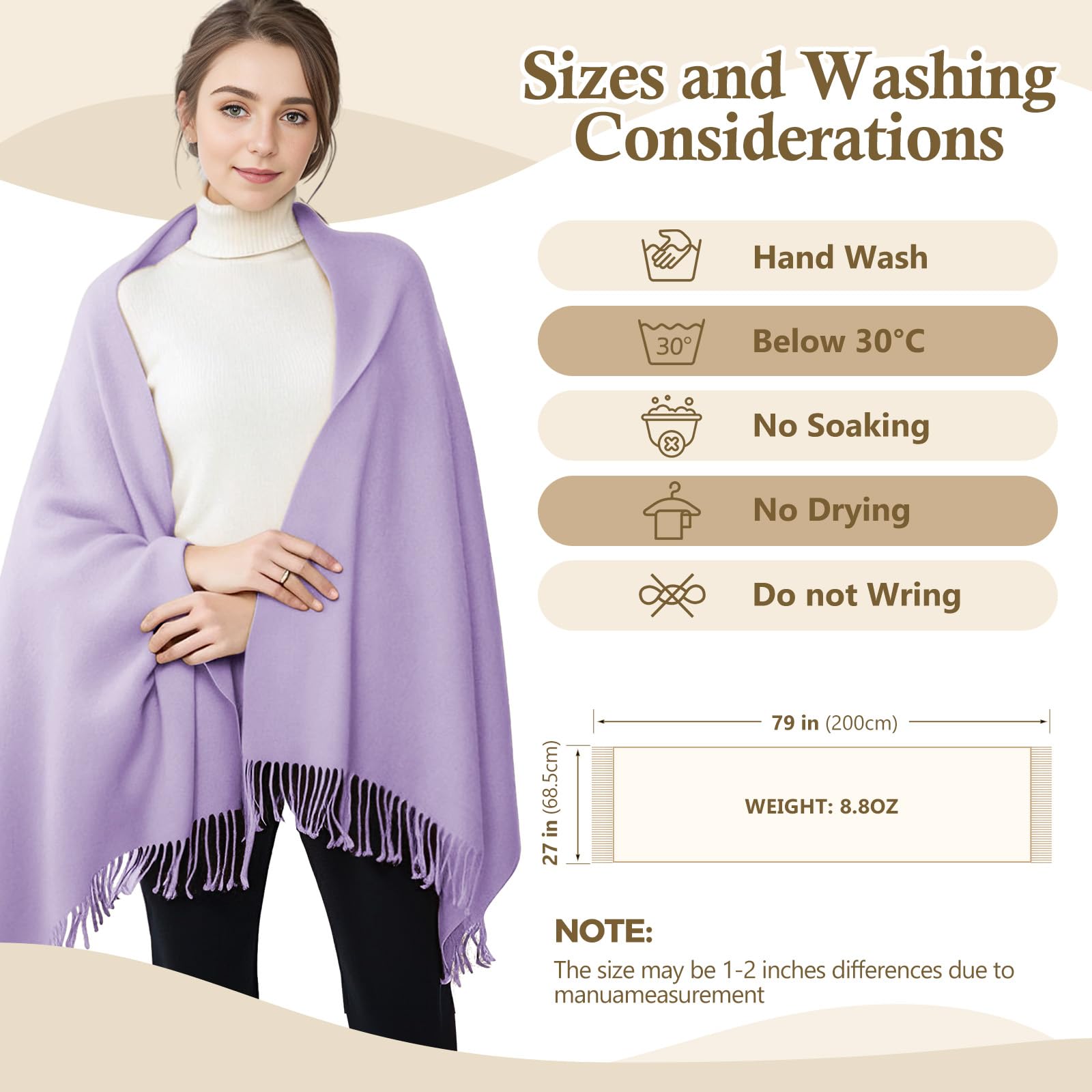 Standard Size & Medium Thickness: Approx 70×200cm (27×78in), ±3cm error for manual measurement. Medium weight, temperature-resistant 14°F-41°F, all-season use. Twice softer than cotton—warm, breathable, multi-use as scarf, head wrap, shawl, blanket, etc.