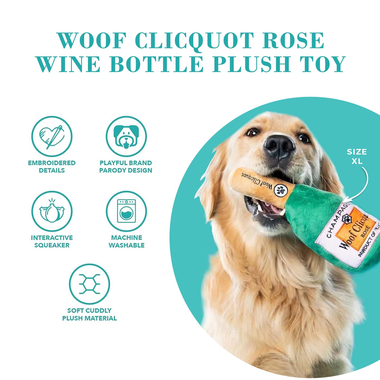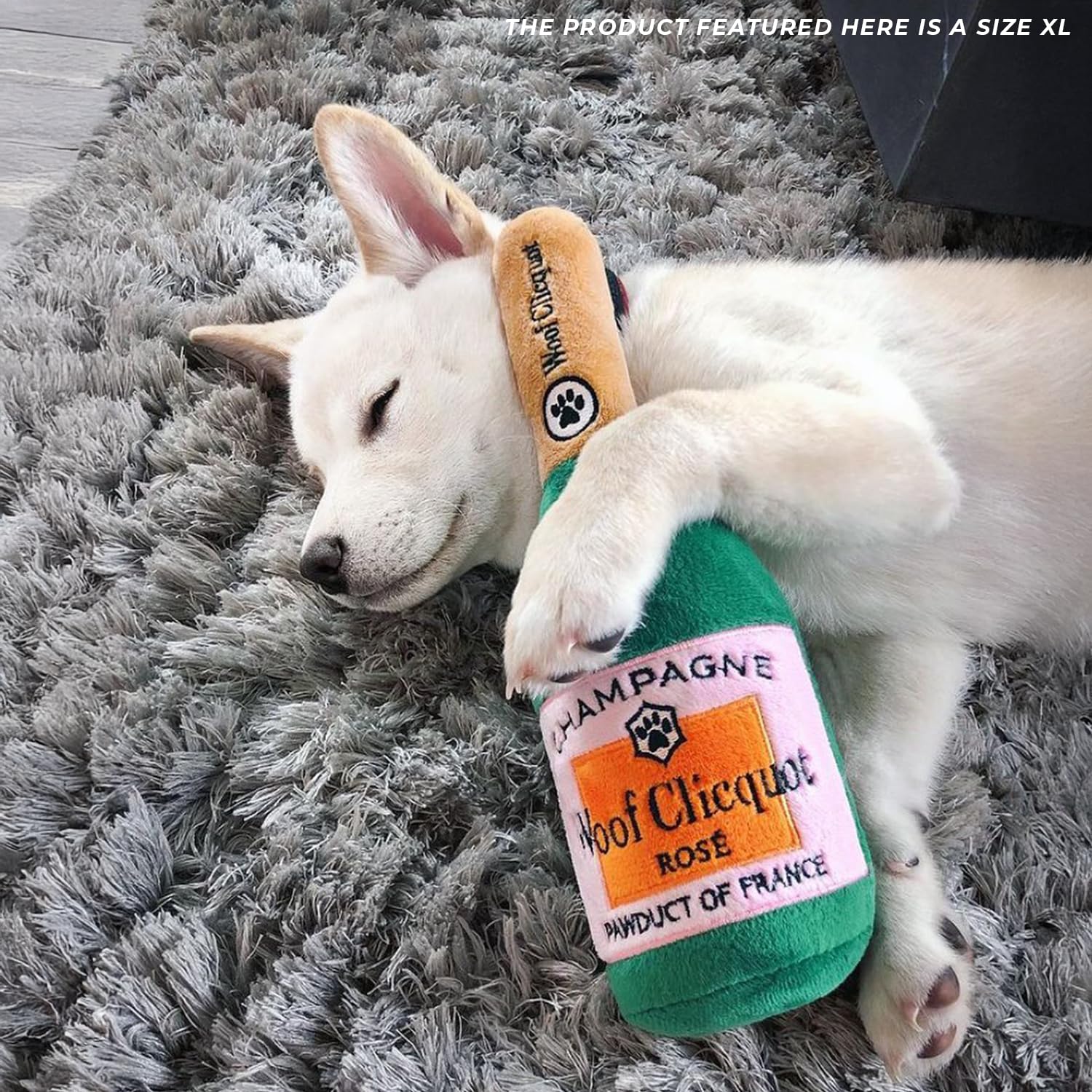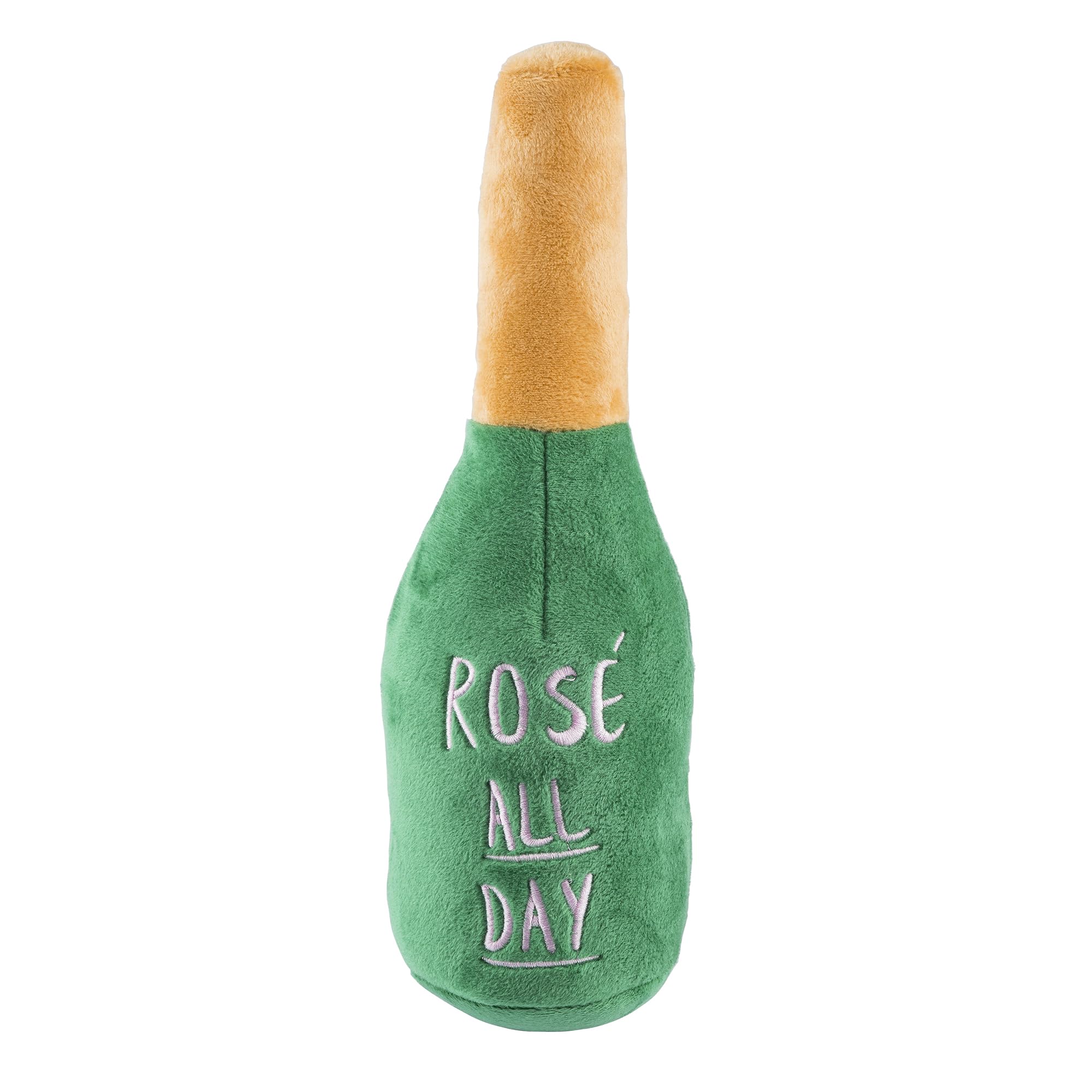 Funny Parody Plush Dog Toy: Time for some fizzy fun with your furry friend by treating them to our Woof Clicquot Rose' dog toy, featuring a dark green velvety exterior with a built-in squeaker hidden inside. Embroidered details on the back read “Rose' All Day”. It’s a playful, cute interactive dog toy that combines style & fun. The XL size features a durable fuse mesh lining that is suitable for aggressive chewers. Size XL 11"x5"x3.5".