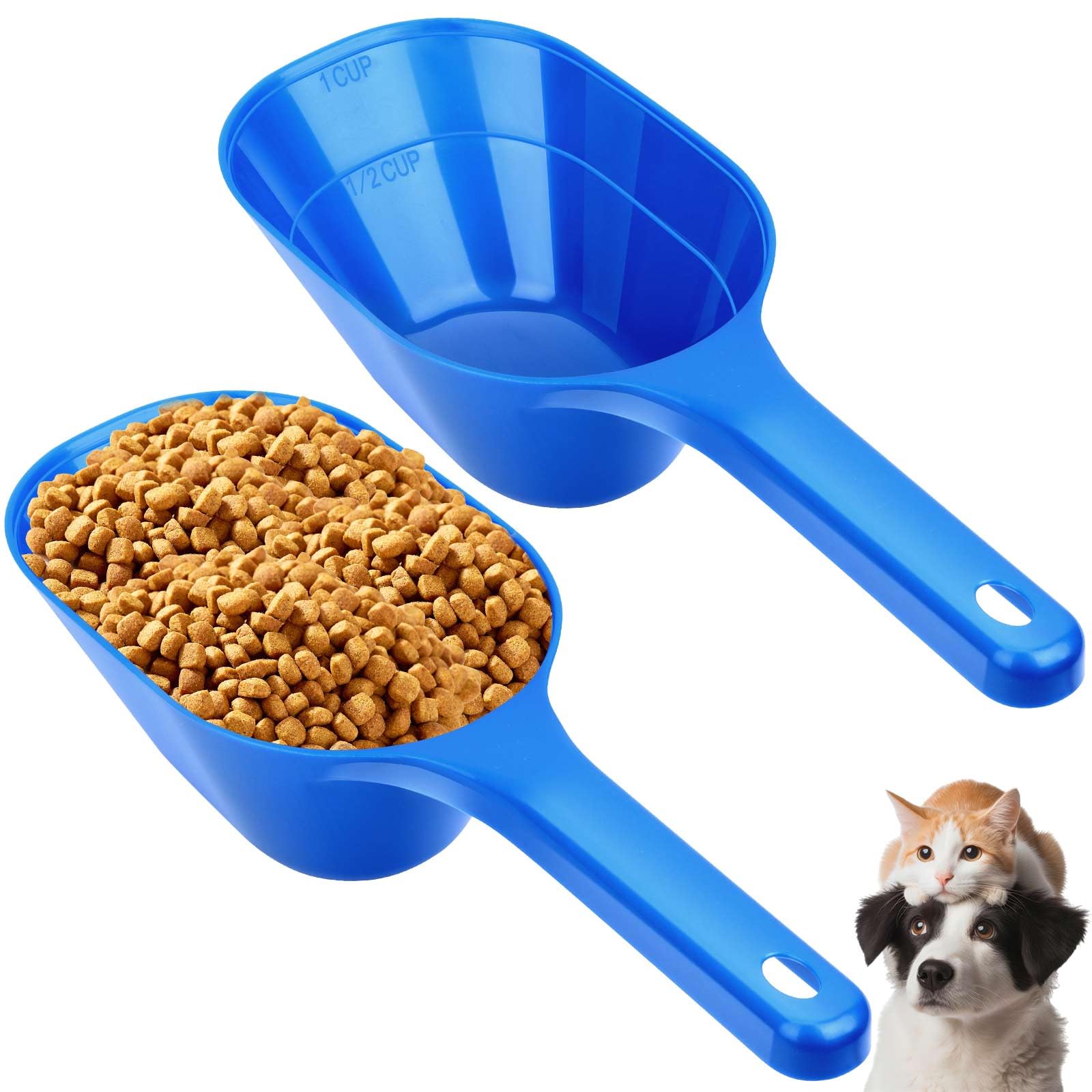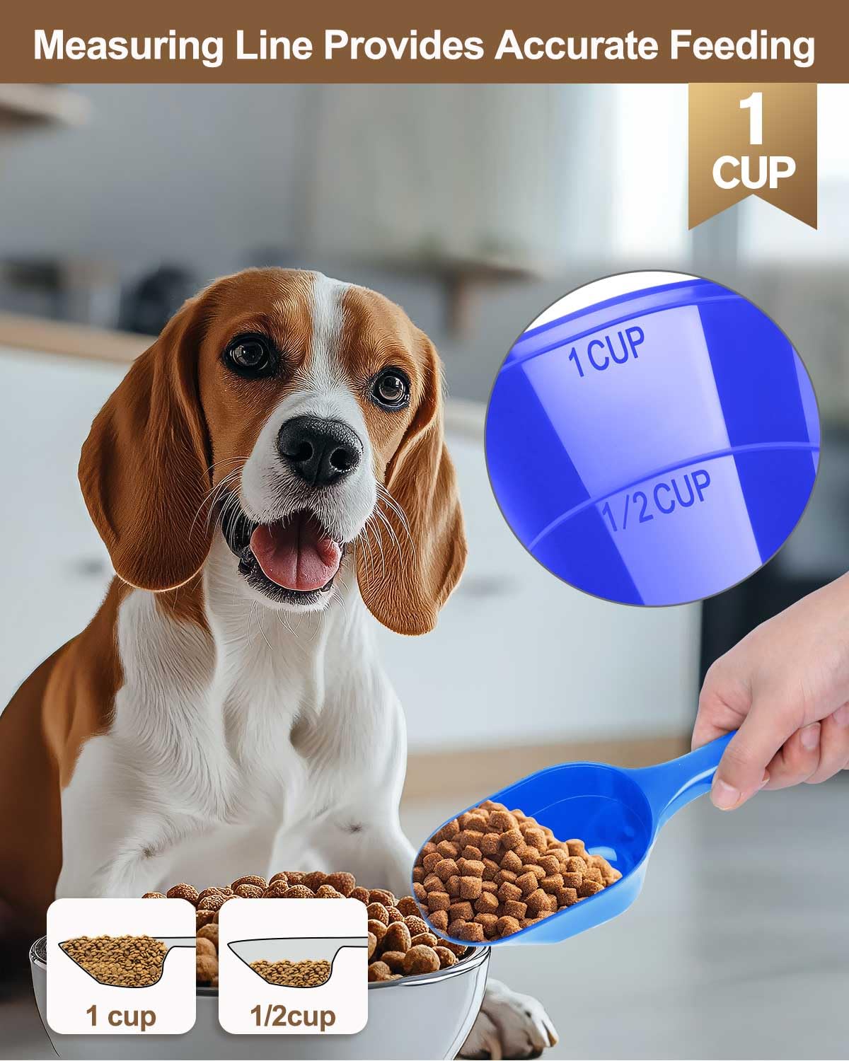 Measures While You Scoop - The dog food measuring scoop includes measurement lines in each cup showing 1/2 and 1 Cup so you can portion servings without a separate measuring cup.
