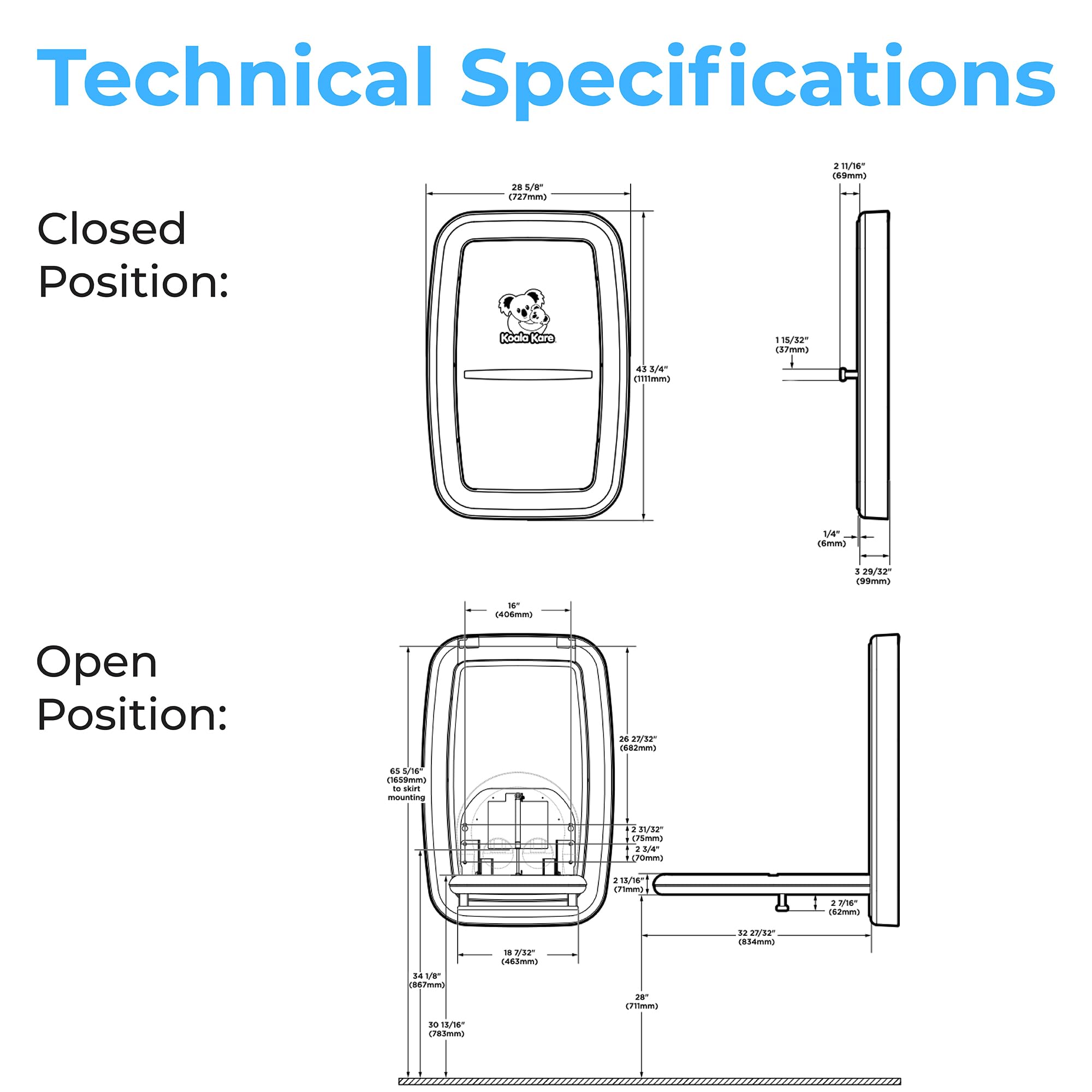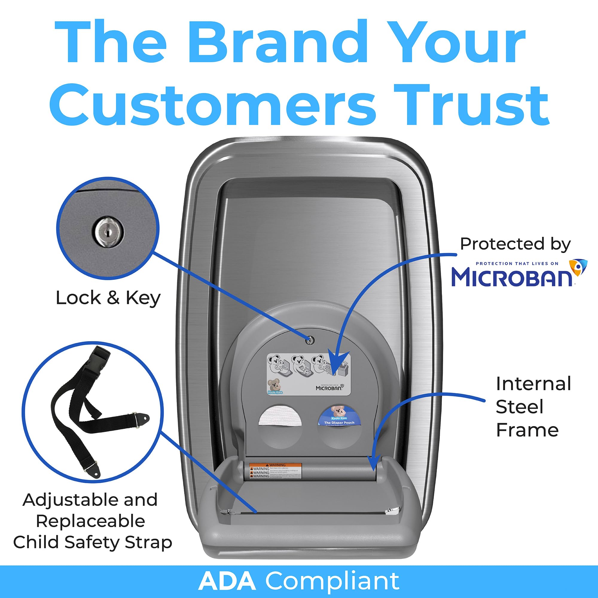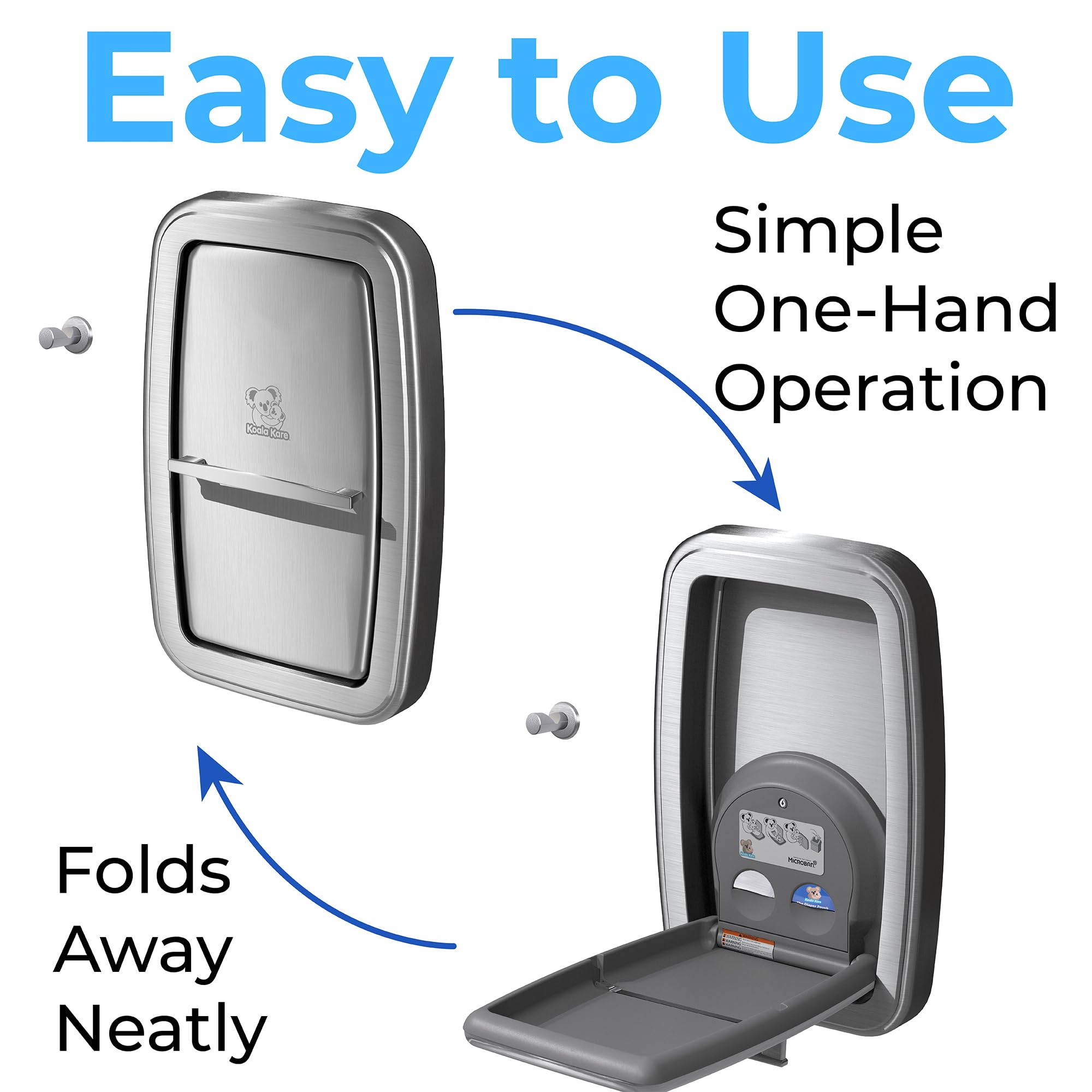 Introducing the Koala Kare KB311-SSWM, a pinnacle of form and function for modern washrooms. This wall-mounted, horizontal baby changing station boasts a seamless stainless-steel exterior, without seams, sharp edges, or weld lines, creating a sleek, sophisticated look. The vertical orientation is a space-saving solution for restrooms with limited wall space. The KB311 is fully ADA and ASTM-compliant. The handle improves the ease of opening and closing station. An internal steel frame increases strength, while the logo is laser-etched and will not smear or wear off. The built-in dispensers provide easy access to sanitary bed liners and diaper disposal bags. Adding to the convenience is a stainless-steel bag hook that mounts on the wall next to the station, thoughtfully positioned for easy access to diaper bags, enhancing the user experience. Microban product protection is built into the bed surface to reduce odor-causing bacteria. Meets ADA and ASTM requirements when mounted properly. When you choose Koala Kare, you are choosing safety, style, durability, and decades of family accommodation expertise.