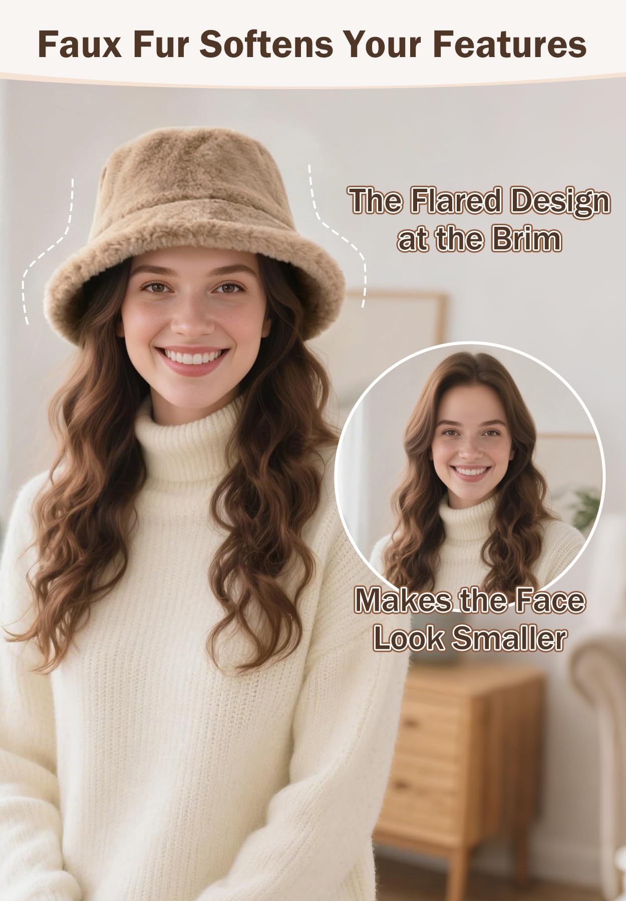 The Flared Design at the Brim: No matter what your head shape or face shape is, can you perfectly wear this furry winter hat. Faux fur softens your features, makes the face look smaller. Wearing it is like having a face-slimming filter on, looking both beautiful and fashionable.