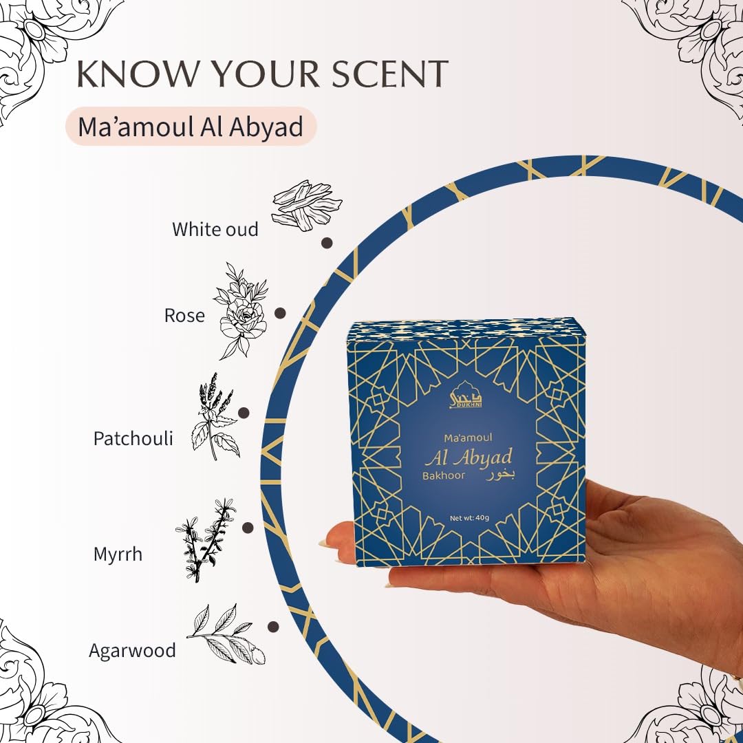 CONTENTS:This includes 1 jar of Maamoul al Abyad Bakhoor. Each jar has 40 grams coin shaped pieces of bakhoor