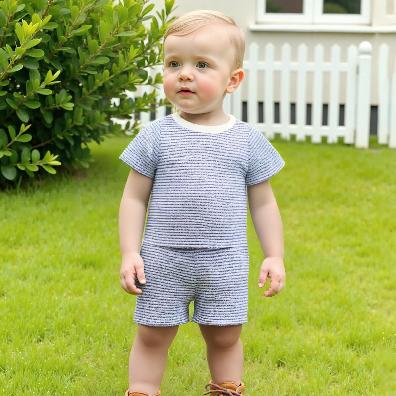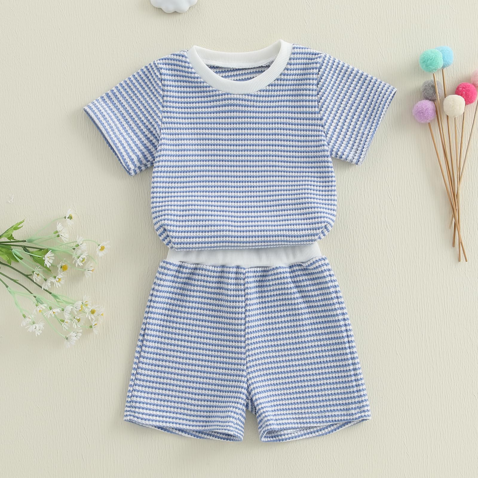 OCCASION: Short sleeve t-shirt top shorts set are matching waffle top, white and striped matching short pants have pocket and adjustable elastic waistband.Baby boy summer outfit, suitable for outings, play, travel, kindergarten, zoos, vacations, summer parties, photography, parent-child activities, family day, and more