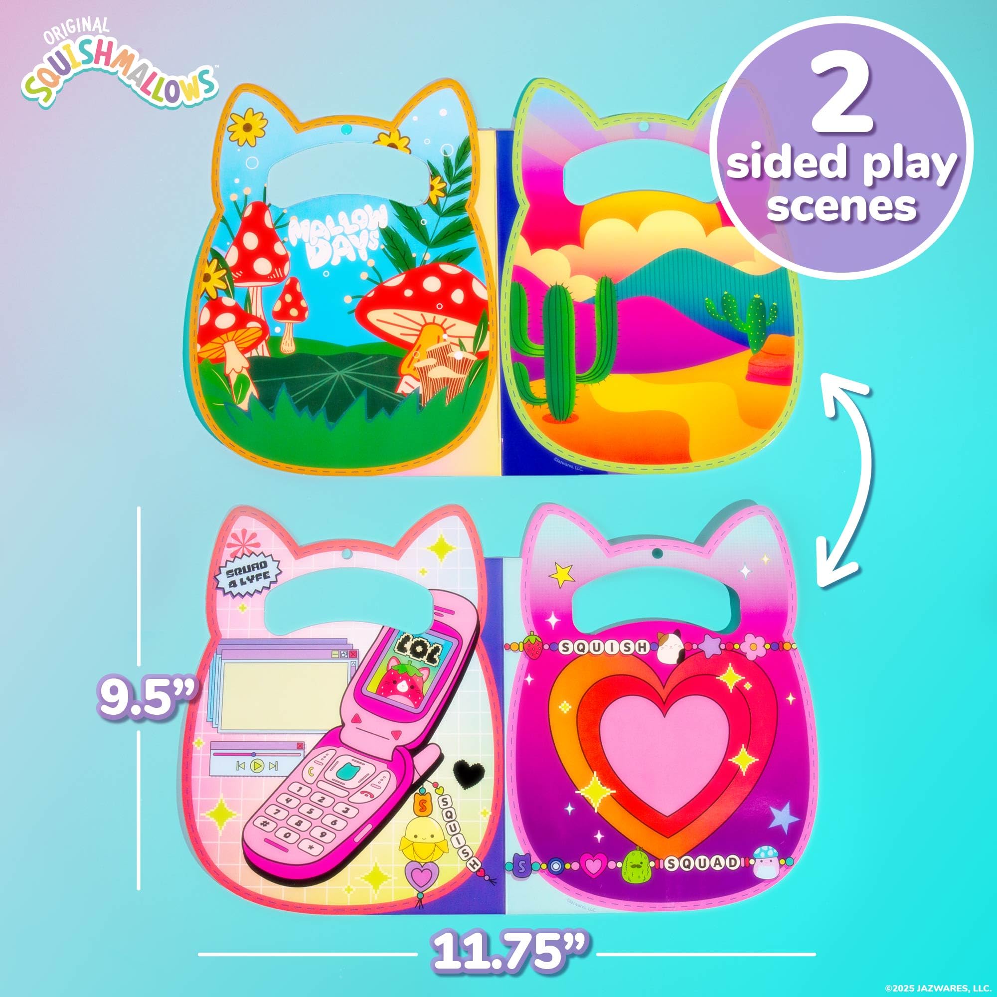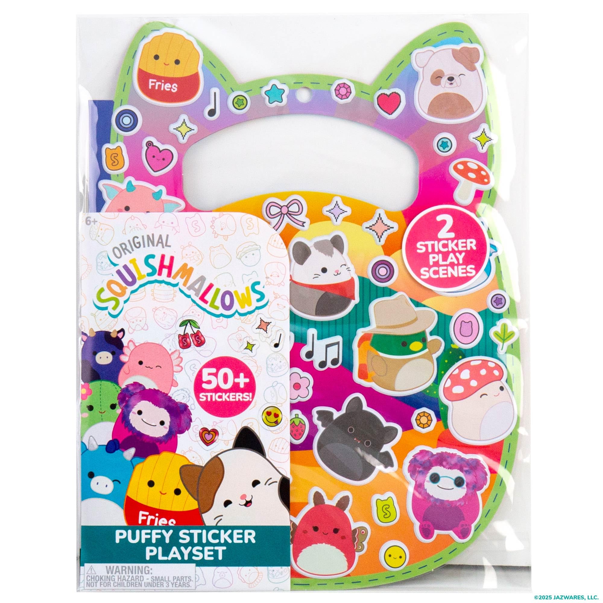 Get ready for squishy sticker fun with the Original Squishmallows™ Puffy Sticker Playset! This reusable kit comes with over 30 soft, squishy puffy stickers featuring fan favorites like Cam, Wendy, Pyle, Woxie, Luanne, Mirren, and more mini Squishmallows! Mix and match them on the double-sided play scene to create endless ’Mallow Day adventures, from a colorful mushroom forest to a cactus desert. Want even more fun? Take the stickers off the scenes and use them to decorate journals, phone cases, laptops, water bottles, and more. With their soft, squishy texture and playful designs, these stickers bring instant Squish Squad energy wherever you stick ‘em! Compact and portable, this set offers a fun, mess-free way to play with your favorite Squishmallows at home or on the go. It also makes a great gift for birthdays, holidays, or just a fun surprise for a Squishmallows fan! Suitable for ages 3 and up.