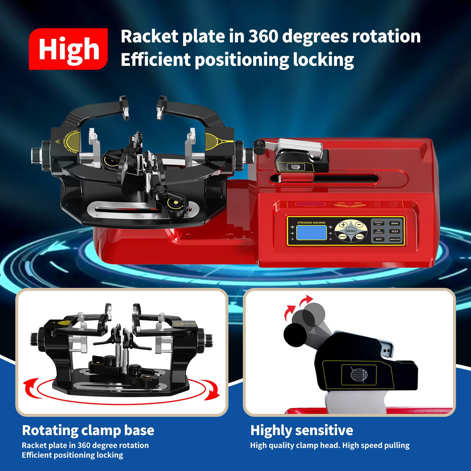 Stringing times memory.DC 24V power supply,suitable for any country.Round work plate with synchronous racket clipping system..Automatic clamp base system.