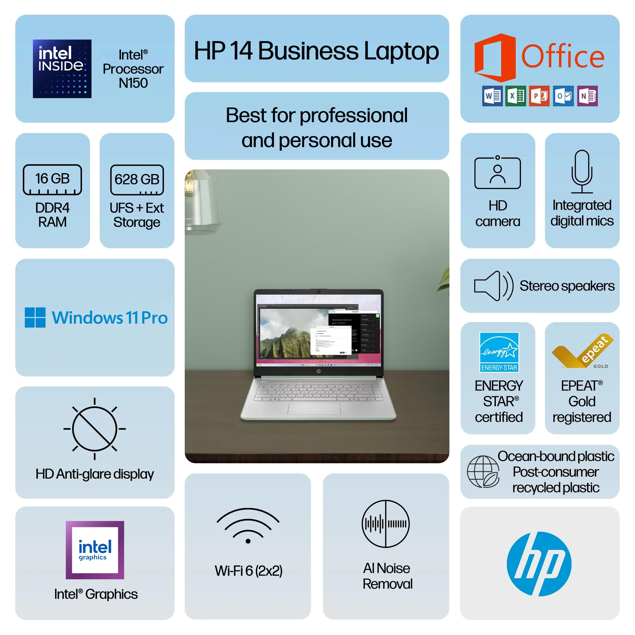 Performance to do more. All-day long. Designed to keep you productive and entertained, this 2025 HP 14-inch laptop PC features Copilot key for AI assistance, long battery life and a thin and portable design. The long-lasting battery life and HP Fast Charge help you stay in the zone longer. Bundle with MarxsolAccessory: 6-in-1 USB-C Docking Station Hub (with USB 3.0, 4K-HDMI, USB-C Connection, SD/TF Card Reader), 500GB Portable Storage Drive, USB extension cord, HDMI cable, mouse pad, and wireless mouse Processor: Quad-Core Intel Processor N150 (Up to 3.6 GHz Max Turbo Frequency, 6 MB Intel Smart Cache, 4 cores, 4 threads) Graphics: Intel Graphics Operating system: Windows 11 Pro Software: Free Lifetime Microsoft Office 2024 Memory: 16GB DDR4 Storage: 628GB (128GB UFS + 500GB External Drive) Display: 14-inch diagonal, HD (1366 x 768), micro-edge, anti-glare, 250 nits Connectivity: Wi-Fi 6 and Bluetooth 5.4 combo Audio: HD Audio with stereo speakers Keyboard: English, natural silver keyboard Webcam: HP True Vision 720p HD camera with temporal noise reduction and integrated dual array digital microphones Ports: 1x USB Type-C 10Gbps signaling rate (supports DisplayPort 1.2) 2x USB Type-A 5Gbps signaling rate 1x Headphone/microphone combo 1x AC Smart pin 1x HDMI 1.4b Battery: 3-cell, 41 Wh Li-ion battery, Up to 9 hours Color: Willow Green Dimensions (W x D x H): 12.76 x 8.86 x 0.71 in Weight: 3.24 lbs