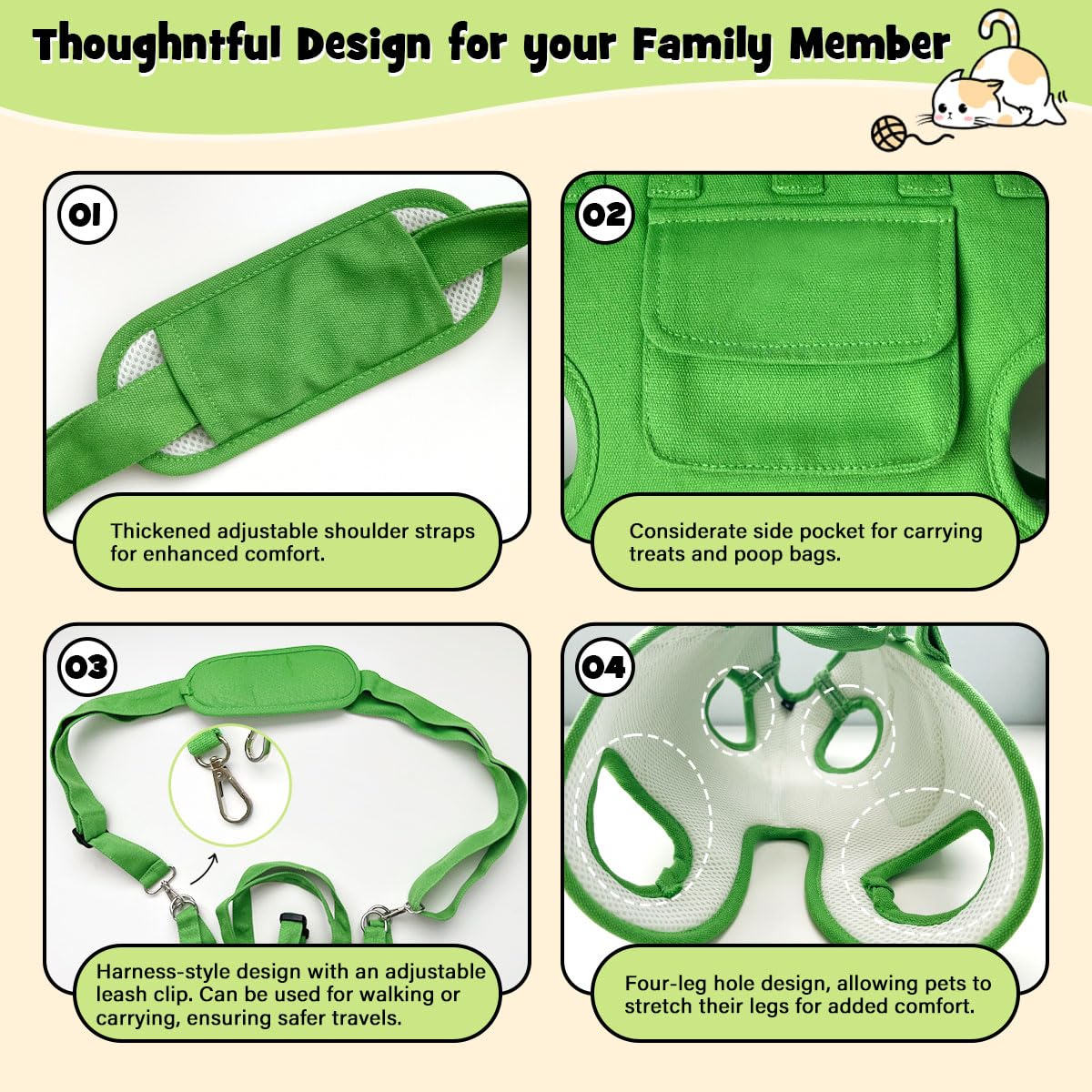 Introducing the Snowlove pet carrier, a versatile and practical solution for pet transportation and walking. This innovative carrier features a unique design with padded leg openings and a secure harness system that keeps your furry friend comfortable and safe. Available in cheerful yellow and green colors, the carrier comes in two convenient sizes to accommodate different pet sizes. The shoulder strap extends from 36.6 to 69.7 inches, providing adjustable carrying options. The durable canvas construction ensures lasting quality, while multiple carrying handles offer flexibility in transport. A convenient front pocket provides storage for small pet essentials. The carrier's thoughtful design includes sturdy metal clasps for the shoulder strap and reinforced stitching at stress points. Perfect for trips to the vet, short travels, or daily walks, this carrier combines functionality with comfort. The adjustable features make it adaptable to various pet sizes and owner preferences. Please measure your pet carefully before selecting the appropriate size to ensure a proper fit.