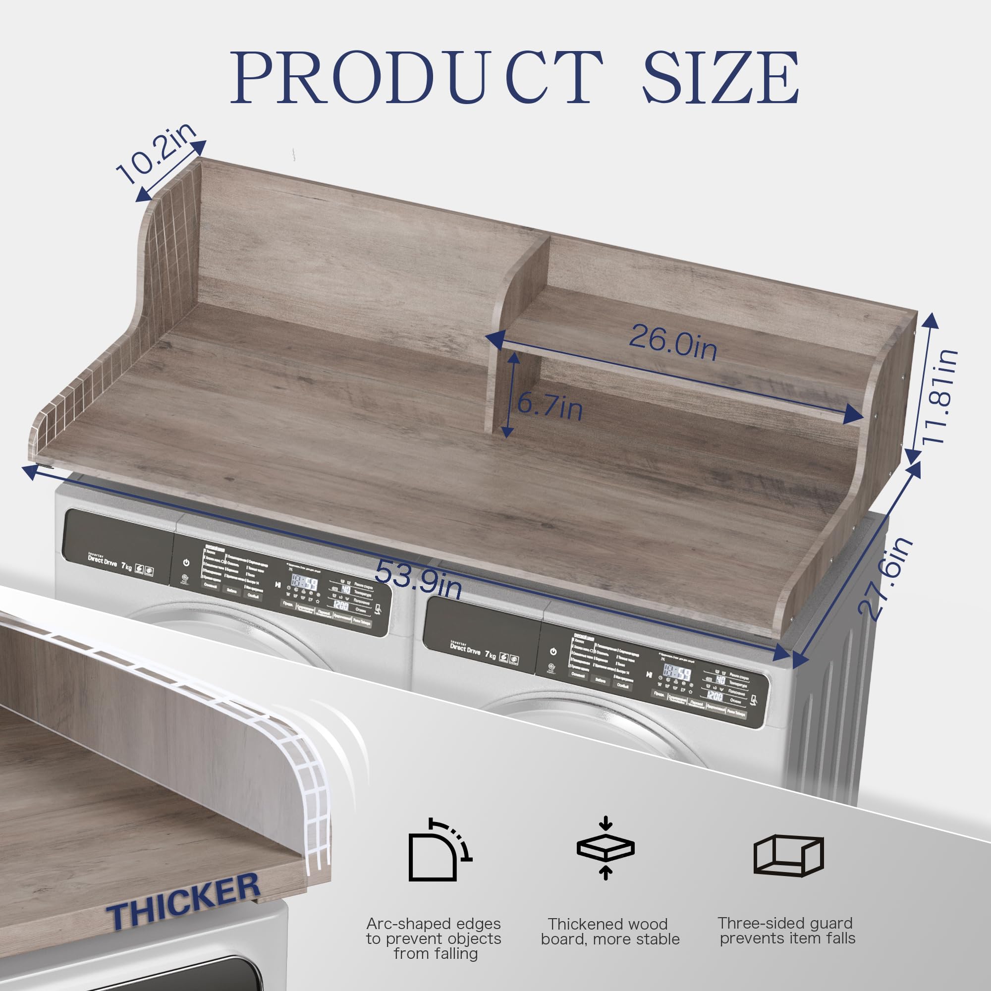 SPACIOUS AND FUNCTIONAL: Our washer and dryer covers for the top measures 54 inches wide and 27.6 inches deep, offering spacious working area for all your laundry needs including folding clothes, sorting laundry, organizing laundry supplies. Our washer dryer wood countertop has 2.4-inch high edge rail above to prevents items from falling off. Our laundry topper could provide a hassle-free washing and drying experience.