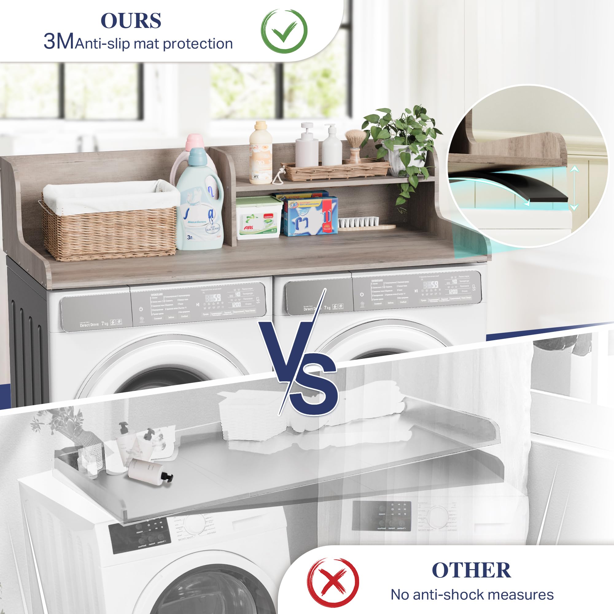 EFFICIENT STORAGE SOLUTION: We designed two spaces for different heights storage. The left side for taller items, such as laundry detergent and storage baskets and the right side with double-layer storage area for low items, such as laundry beads. Our washer dryer countertop is integrated with operation and storage, so you can not only have a large operating countertop, but also have extra storage space for diverse needs.