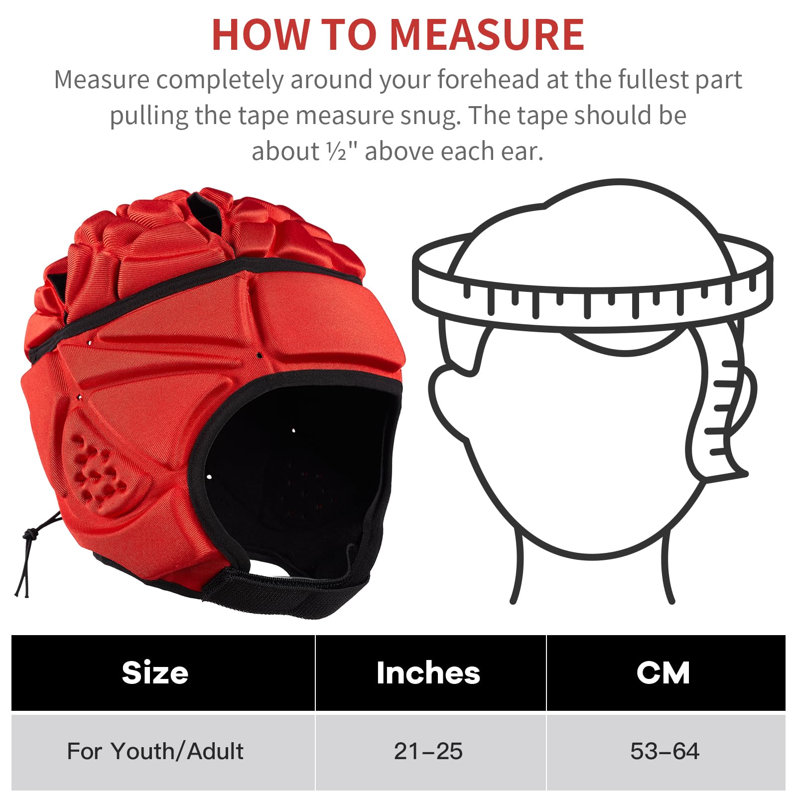 Size of the football helmet, please refer to the size chart in the photo section. L=21-23 inches (54-58cm) suitable for people over 12 years old. It is really easy to put on and take off this football helmet, you just need to fasten the chin to attach the rugby helmet to your head.