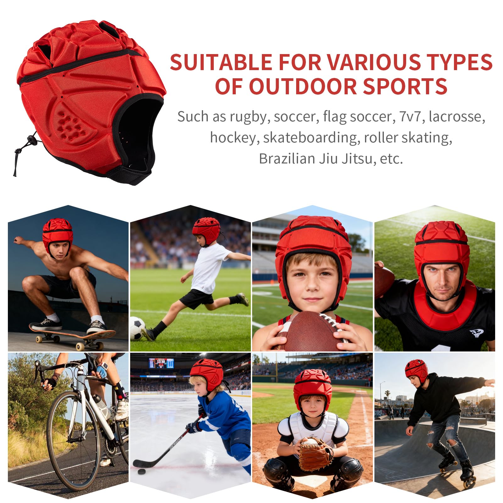 Wide range of application scenarios, suitable for 7v7, rugby, football, hockey, skateboard, roller skating, Brazilian Jiu-Jitsu and other outdoor sports. And the adjustable chinstrap and elastic back rear laces, this football helmet suit for different age like kids, youth, adults to use.
