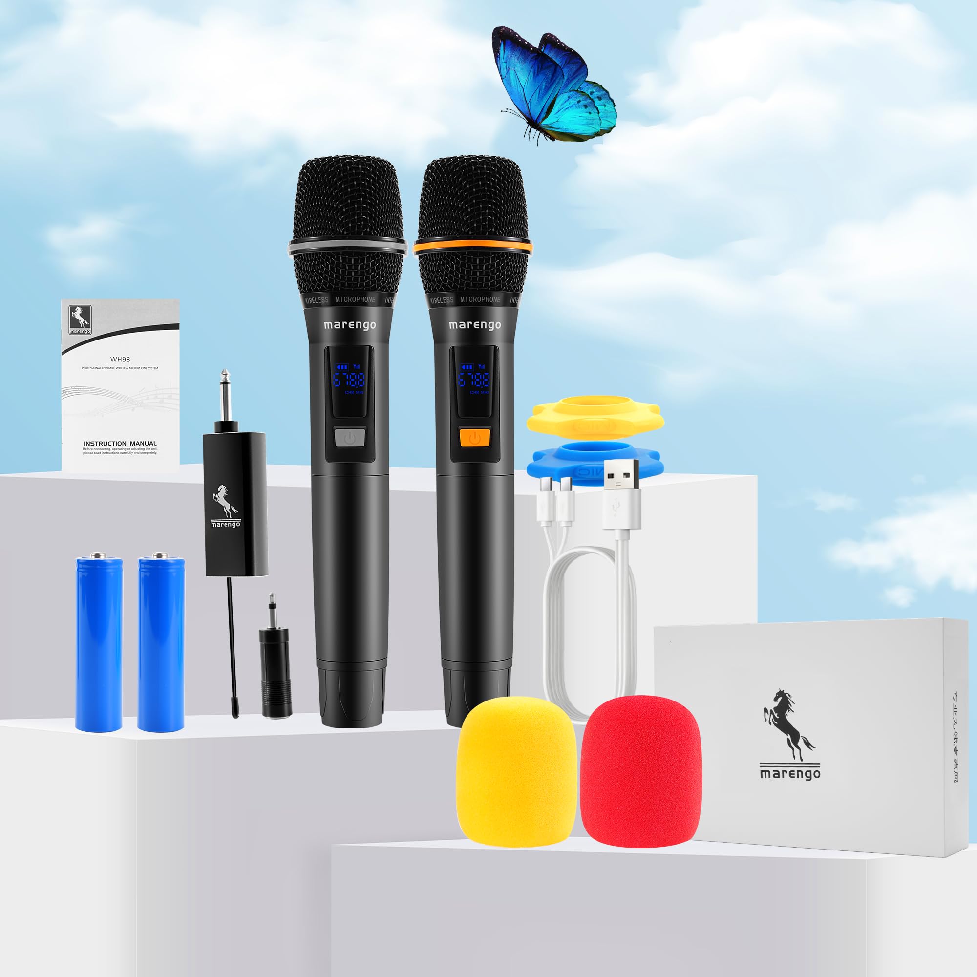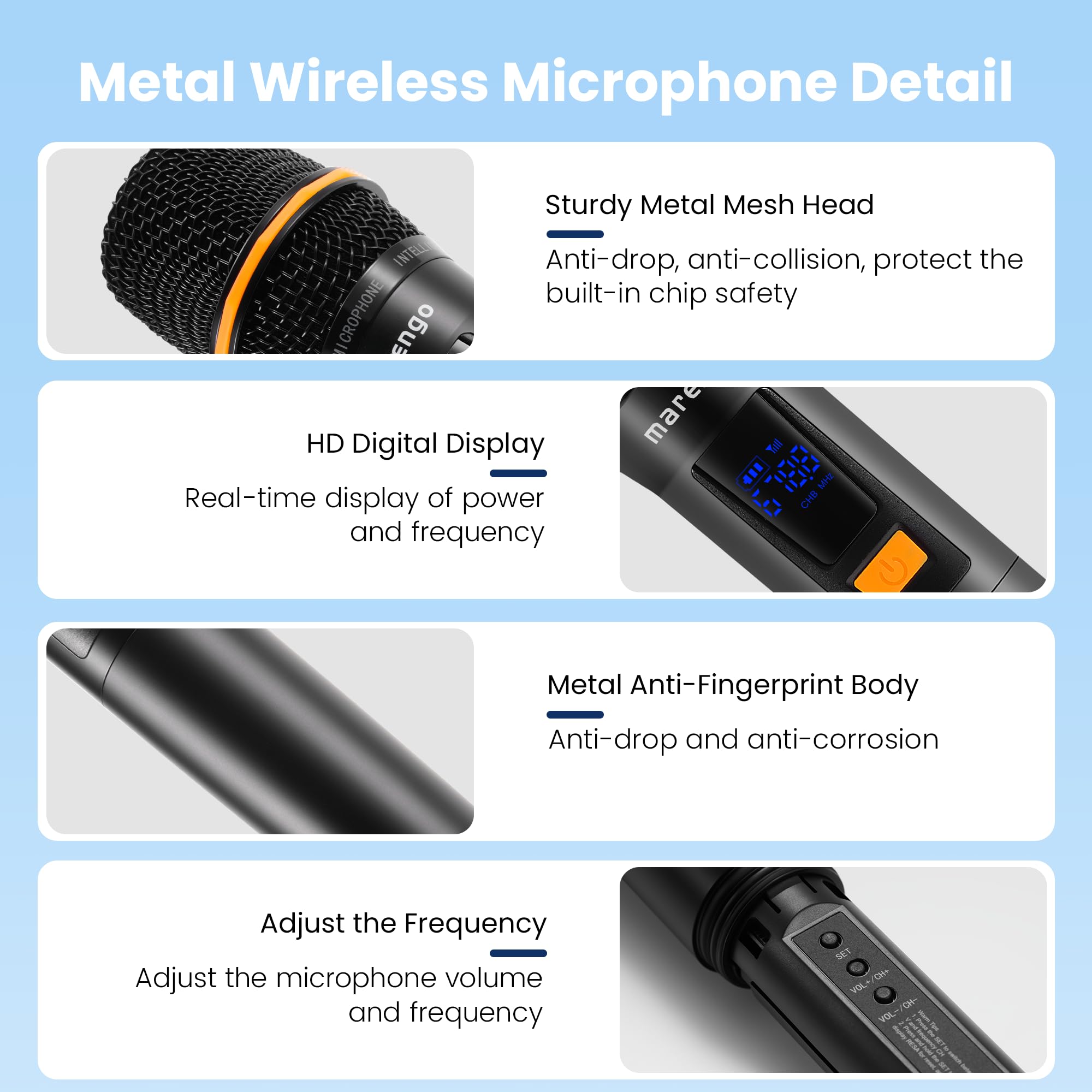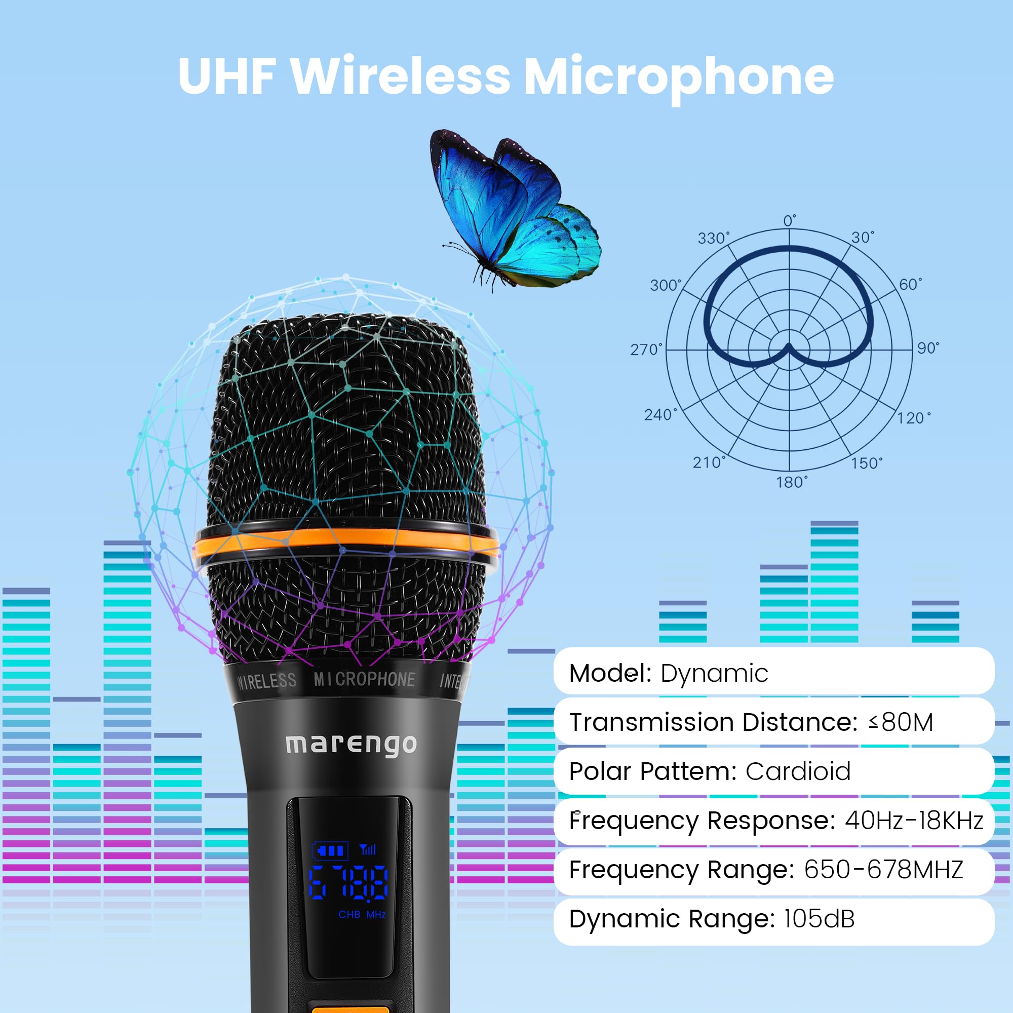 【High-Quality Chip】Marengo dynamic wireless microphones adopts cardioid pickup pattern and DSP chip technology. One-to-one chip connection. Microfonos inalambricos professional has stable signal connection, anti-interference and noise reduction functions. Perfect choice for karaoke, singing, speeches, parties and weddings!