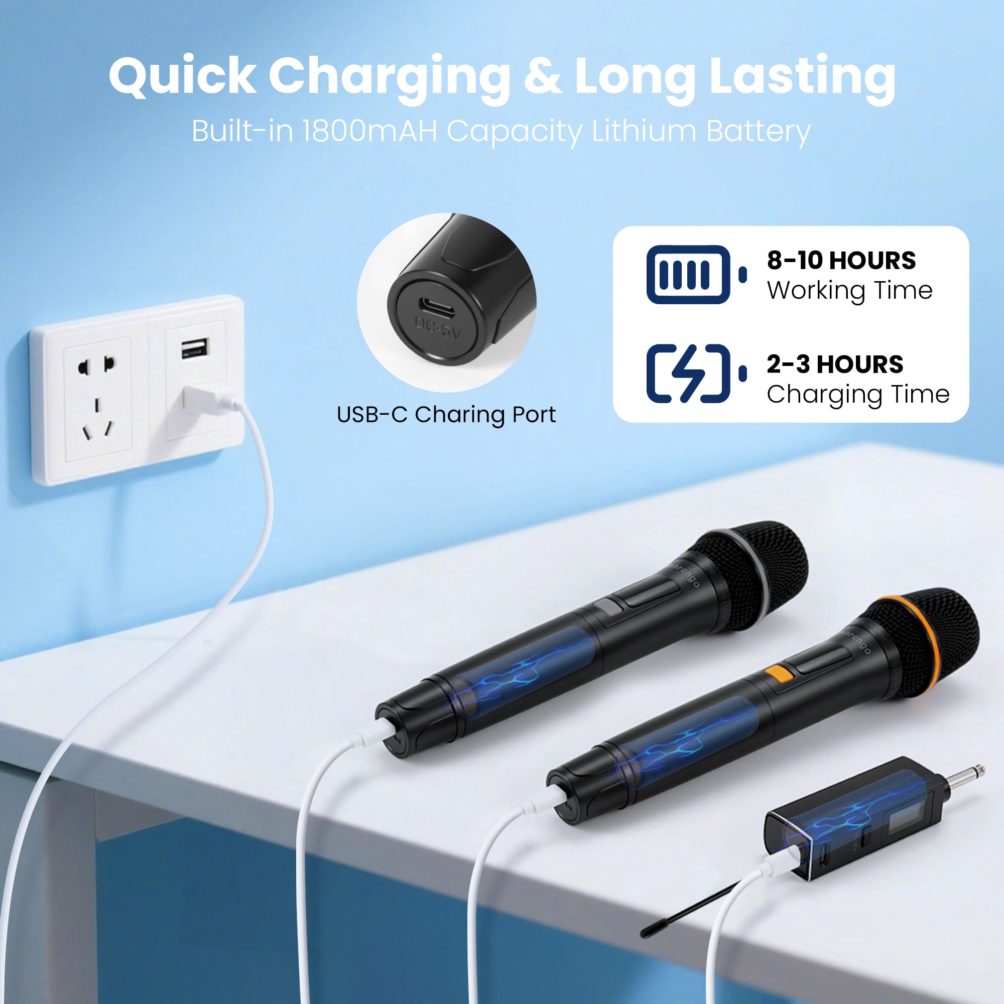 【Rechargeable Wireless Microphones】Rechargeable Cordless microphone and receiver feature built-in 1800mAh rechargeable batteries, use USB-C charging port for charging, only 2-3 hours charging, karaoke microphone wireless can achieve 8-10 hours of continuous use. Say goodbye to constant battery buying!