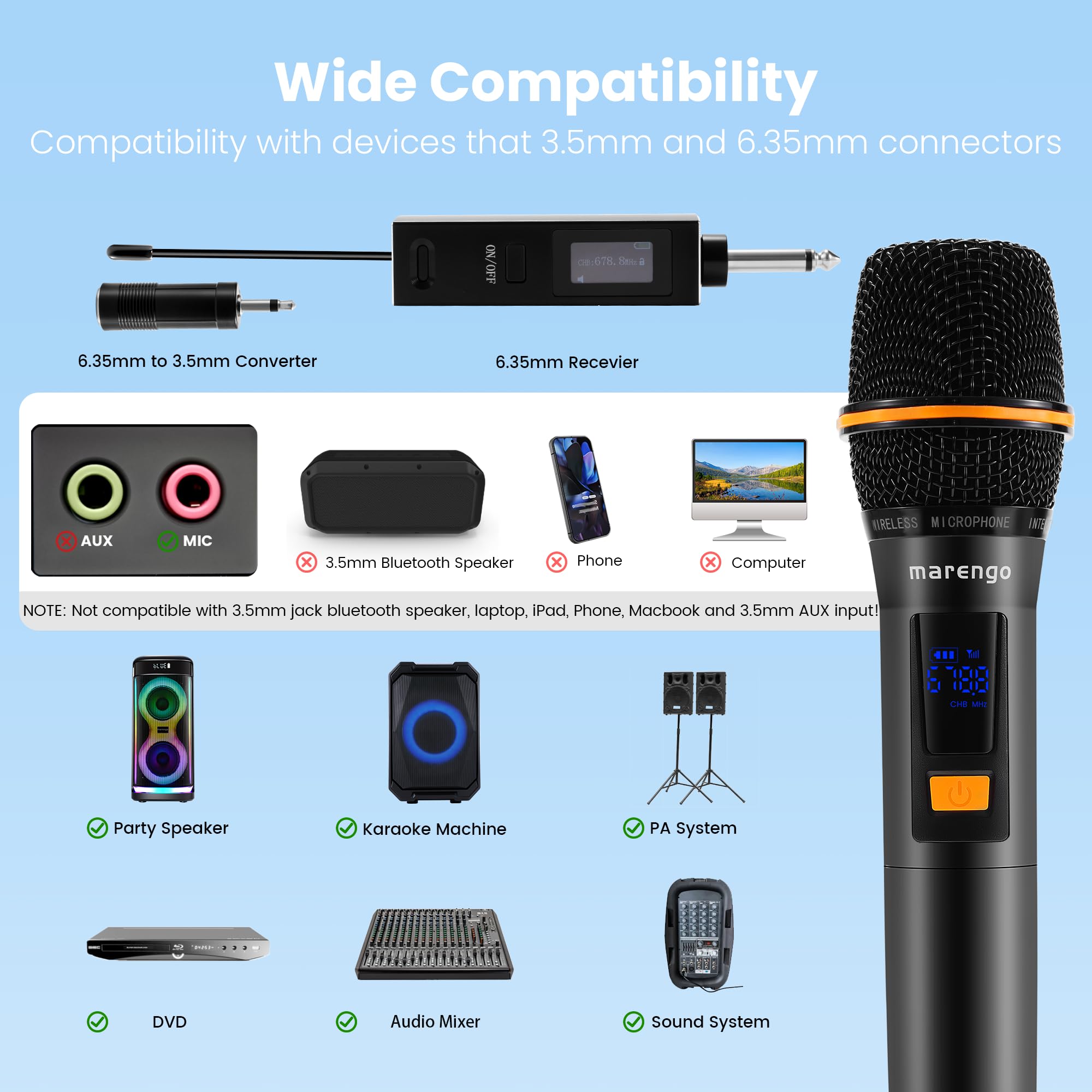 【Important Instructions】For first use, charge the microphone and receiver for 30 min. Wireless microphones only supports the MIC INPUT jack(Not AUX ports), receiver must be connected to devices with a 6.35mm microphone port, Compatible with MIC INPUT Party Speaker, Singing Karaoke Machine, Audio Amplifier, PA System, Mixer, Voice Amplifier, etc.(Note: Not compatible with 3.5mm bluetooth speaker, laptop,iPad, Phone and AUX input), Please make sure the microphone input is correct before purchasing.