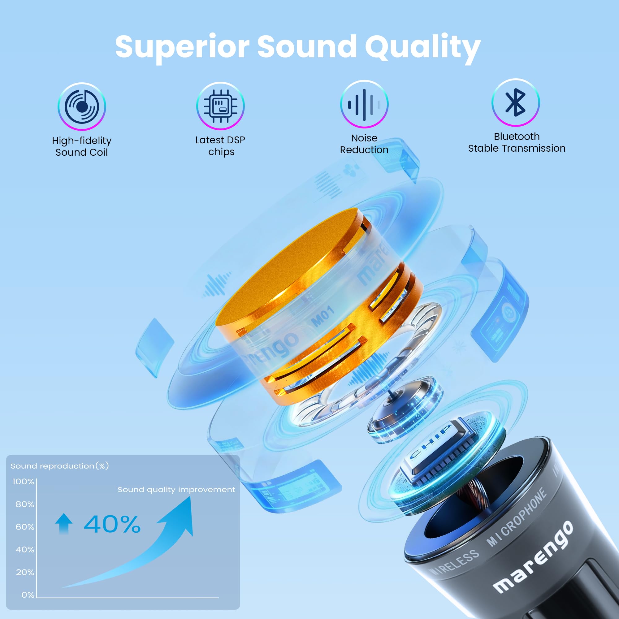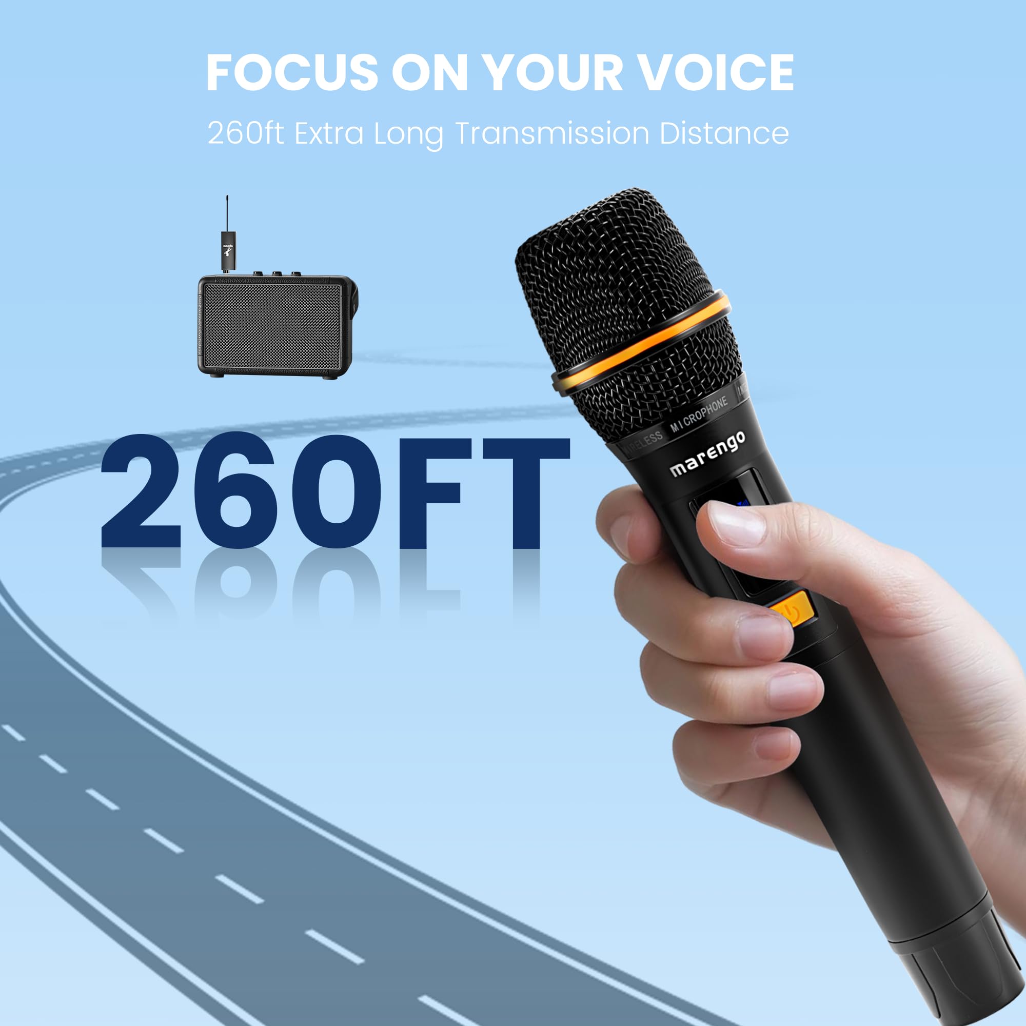 【Professional Performance】Marengo wireless bluetooth microphone adopts advanced UHF transmission technology to provide stable, high-speed connection, wireless mic system has a maximum receiving and transmission distance of 260ft(80m), ensuring zero delay and uninterrupted transmission for exceptionally smooth performance.
