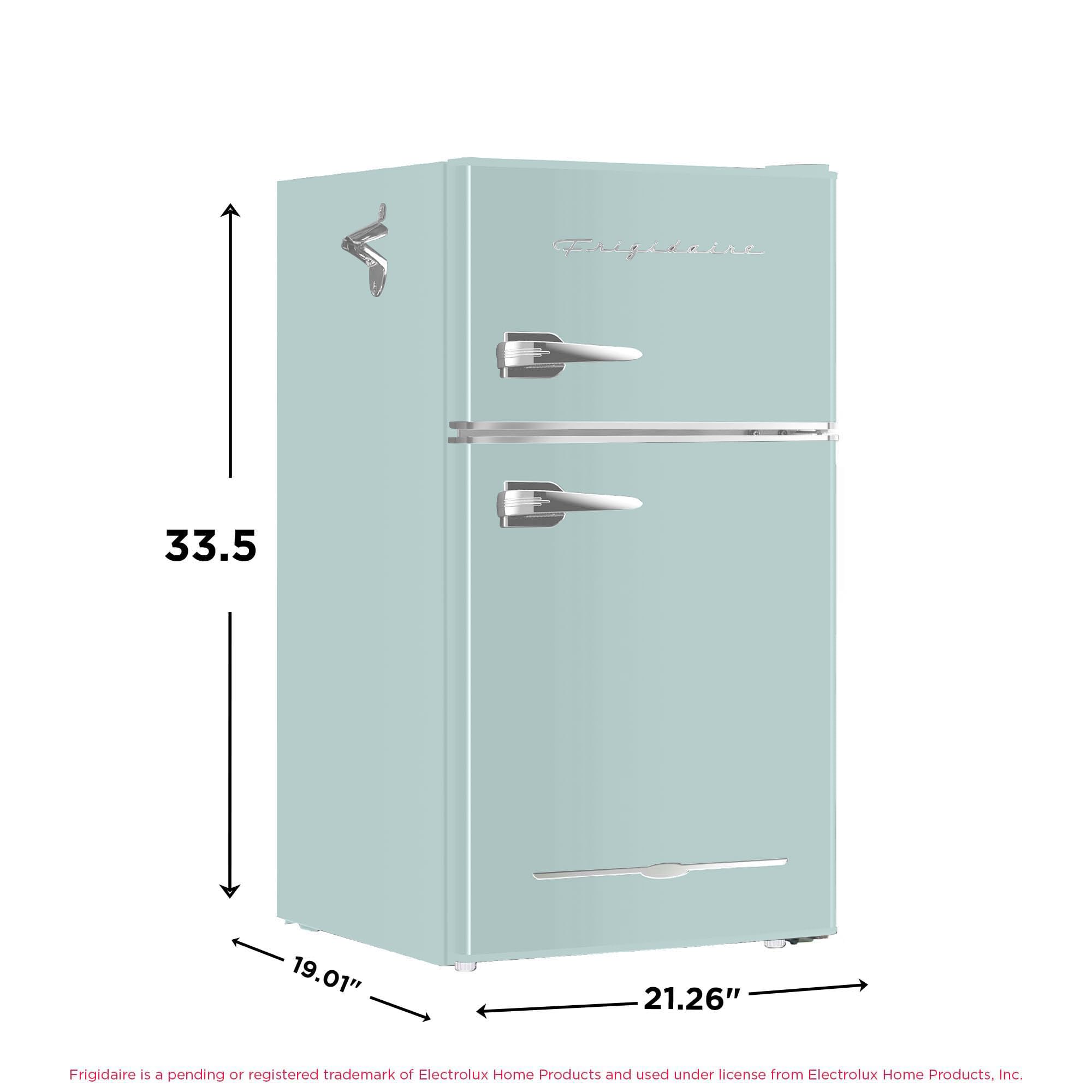 Keep snacks fresh in this 3.2 cu. ft. two-door Frigidaire bar refrigerator. The flush-back design lets you place it close to the wall to save space, and the handy built-in bottle opener eliminates the need to search through gadgets. The silver decorative embellishments on this black Frigidaire bar refrigerator convey a sleek, stylish look.