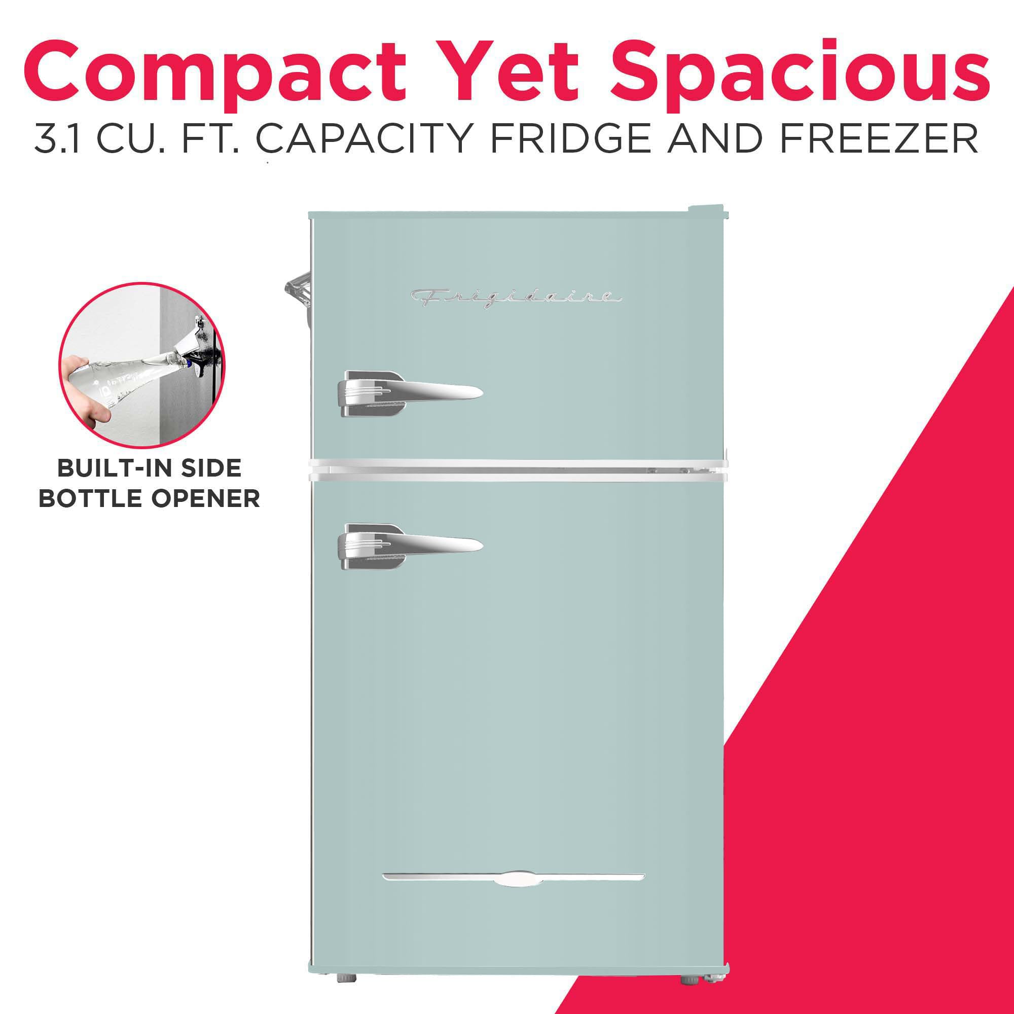 PLENTY OF STORAGE: This 3.2 Cu Ft mini fridge has a lot of storage with a .25 Cu Ft freezer with ice cube tray. Refrigerator compartment has a crisper drawer and 2 shelves. Side can dispenser for soda and drinks. Bottle opener on the outside of the fridge.