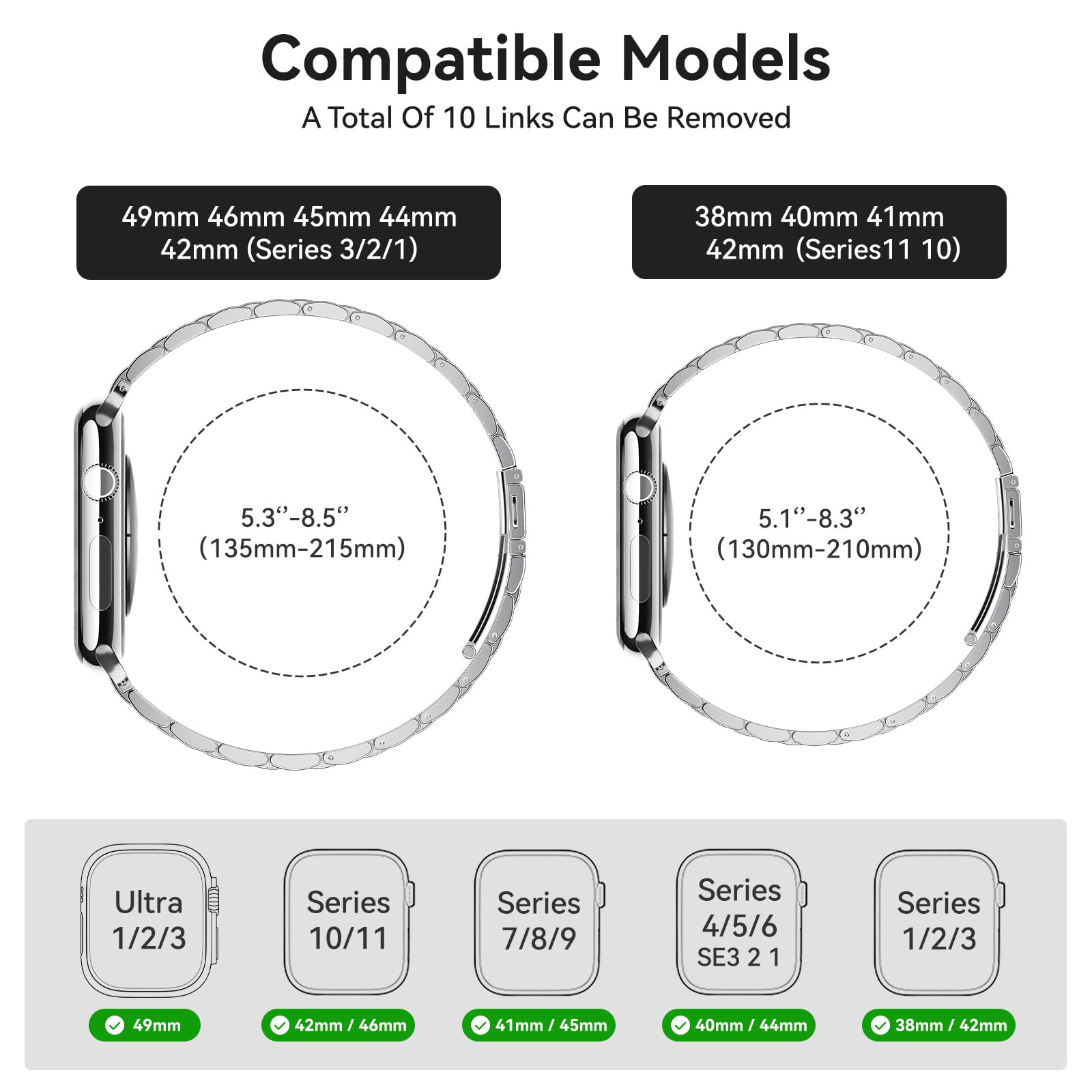 Adjustable Length: SUNFWR apple watch bands fit 5.3"-8.5"(135mm-215mm) wrists and are compatible for Apple Watch 45mm (Series 7/8/9), 44mm (Series SE3/SE2/SE/6/5/4), 42mm (Series 3/2/1),46mm(Series 11/10),49mm(Ultra 3/2/1) . Ten links can be removed. Comes with removal tool which makes you to easily adjust the length of the band that suits you.
