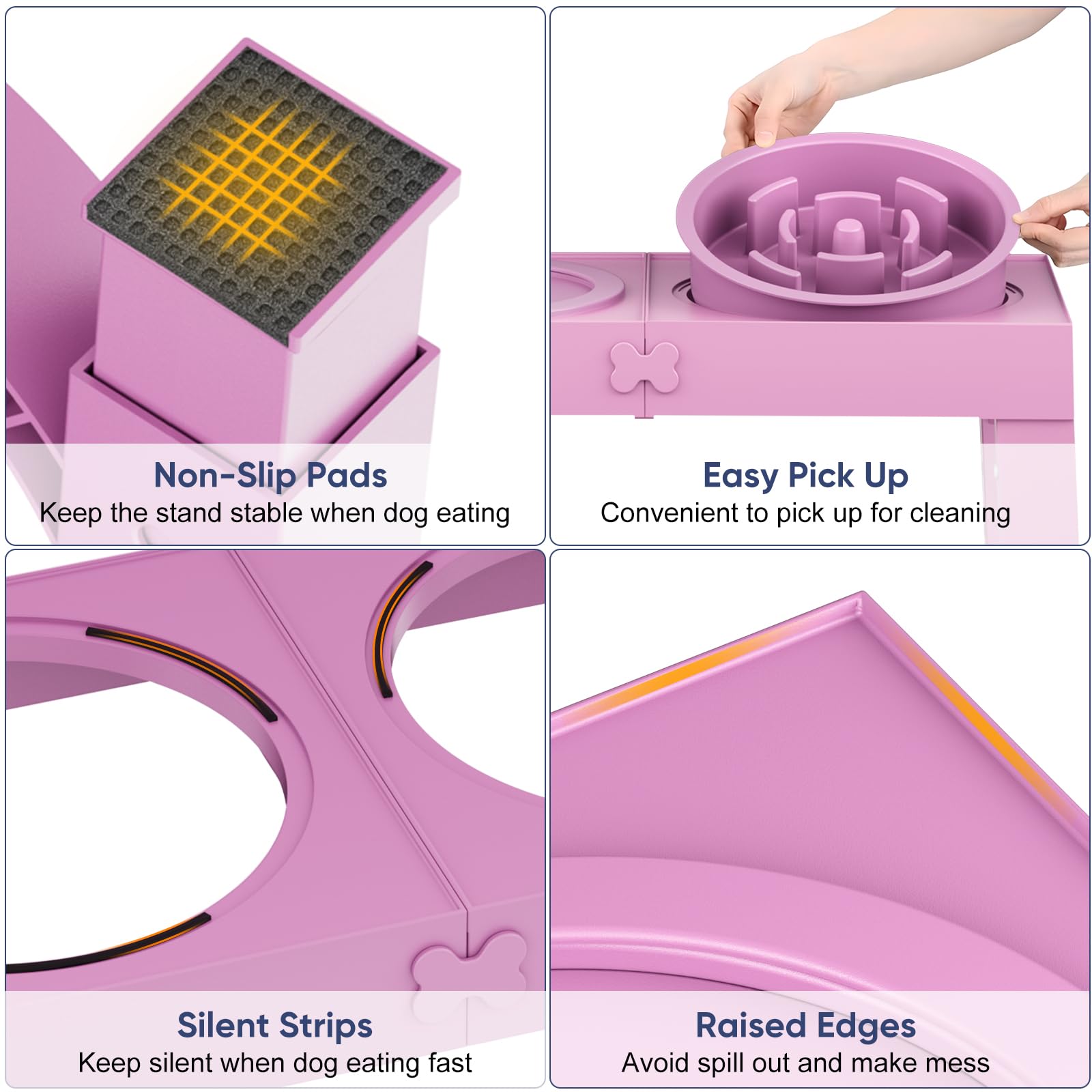 ANTI-SLIP QUIET DURABLE: The non-slip pads and the silent strip on the elevated dog bowl stand, prevents it from being accidentally knocked over by your dog, but also ensures that the bowl and stand stay stable even during vigorous eating. Avoid daily hassle of cleaning up the floor after your dog's meal!