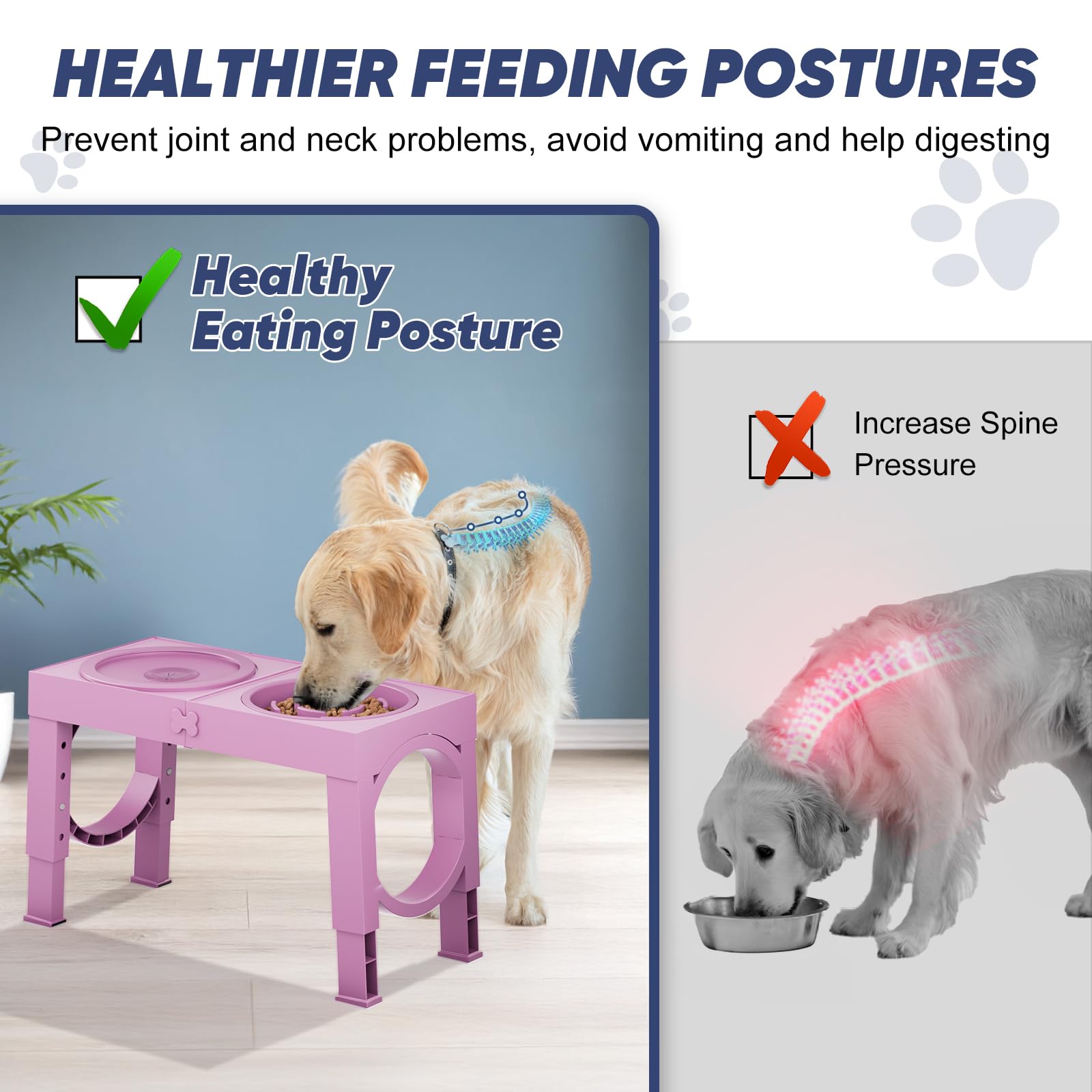 FOR SENIOR DOGS: Effectively protects the spine and neck, avoiding appetite problems caused by prolonged uncomfortable posture. An adjustable dog bowl stand for dogs that tend to vomit when eating, have limited mobility, and suffer from arthritis.