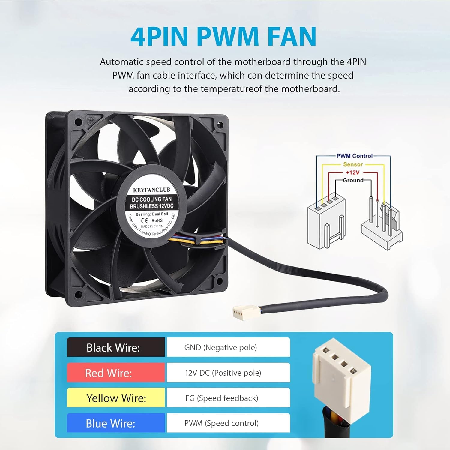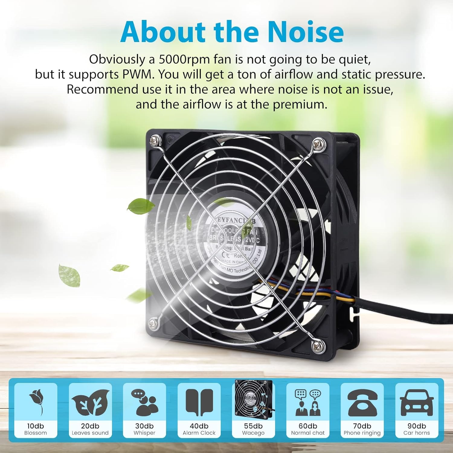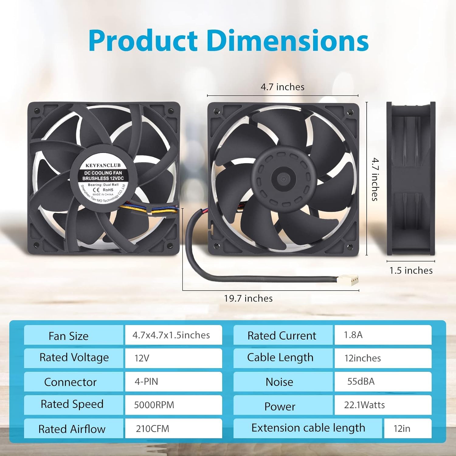 【High Air Flow fan】Dimension: 4.7"x4.7"x1.5", Voltage:12v, Current: 1.8A, Connector: 4-PIN, Speed:5000RPM, Airflow:215CFM, Noise:55dBA