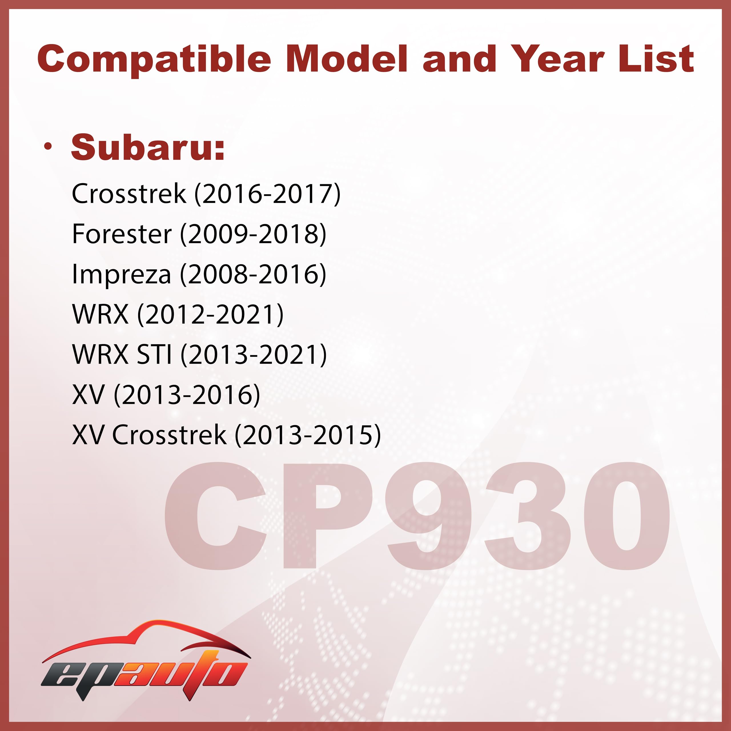 Compatible with Sabaru Auto Models: Crosstrek (2016-2017), Forester (2009-2018), Impreza (2008-2016), WRX (2012-2021), WRX STI (2013-2021), XV (2013-2016), XV Crosstrek (2013-2015)
