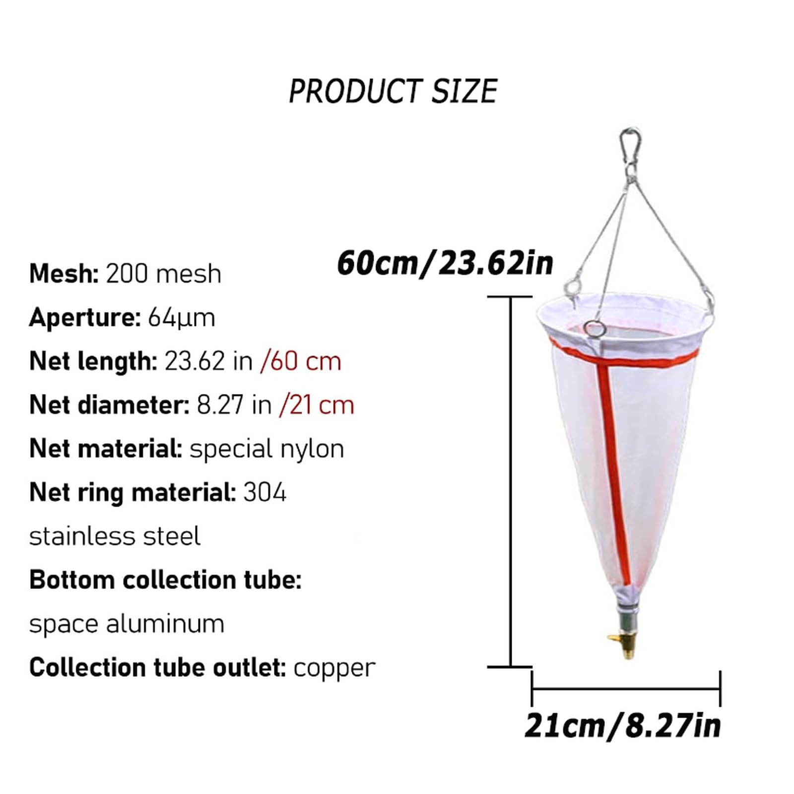 PARAMETERS: Aperture: 64μm, Net length: 23.62in, Net diameter: 8.27in, Net material: special nylon, Net ring material: 304 stainless steel, Bottom collection tube: space aluminum, Collection tube outlet: copper