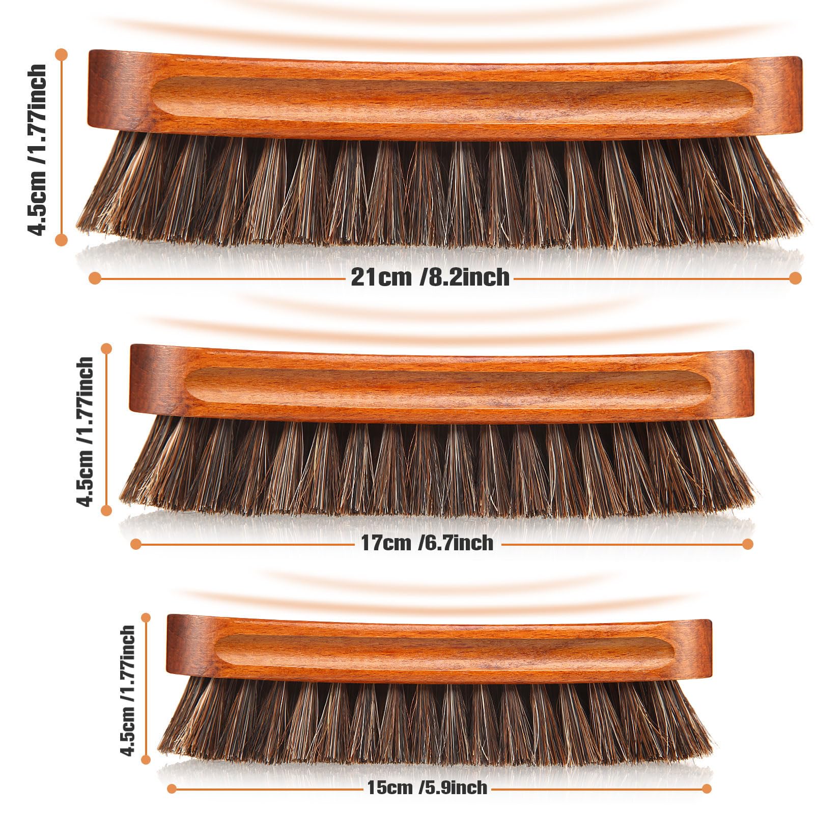 Use of each brush: The big horsehair shine brush fits for large area surface cleansing or shoes or leather; Product details: Color: as picture shown Size: as picture shown Brush material: horsehair, beech Package includes: 1 x Extra Large Horsehair Polishing Brush 1 x Large Horsehair Polishing Brush 2 x Medium Horsehair Polishing Brush