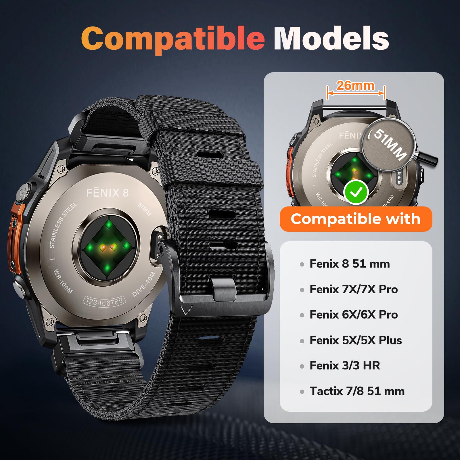 【Watch Band for Garmin】 CUZOW quickfit 26mm watch band is compatible with Garmin Fenix 7X/Fenix 6X/Fenix 5X/Fenix 8/8 Pro 51mm/5X Plus/6X Pro/7X pro/ Tactix 7/Descent MK1/Mk2/Mk3i 51mm/Quatix 7X/D2 Delta PX/D2 Charlie/Epix Pro 51mm (NOT FIT for Fenix 7S/6S/5S/Fenix 7 Pro/6 Pro/Fenix 5/5 Plus!)