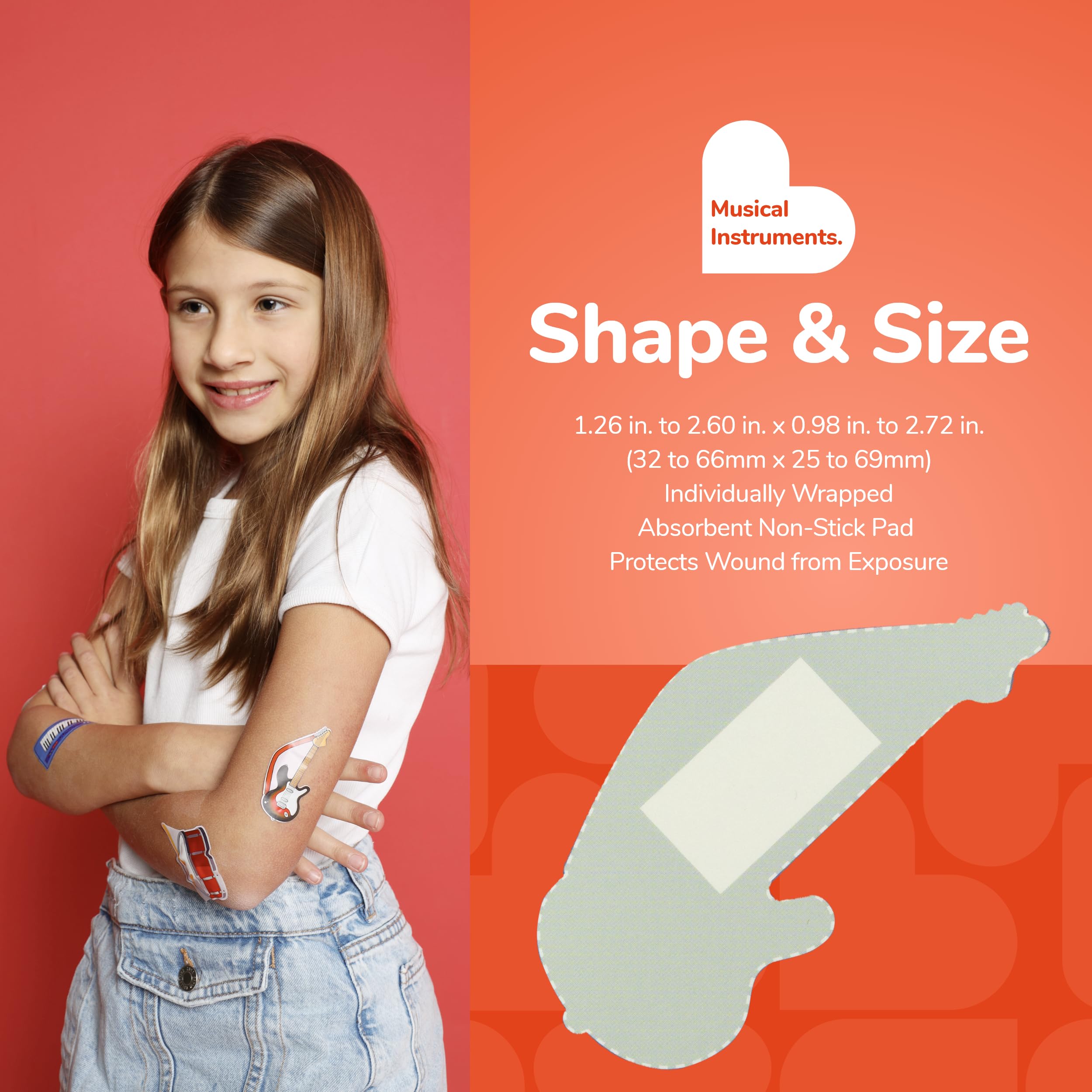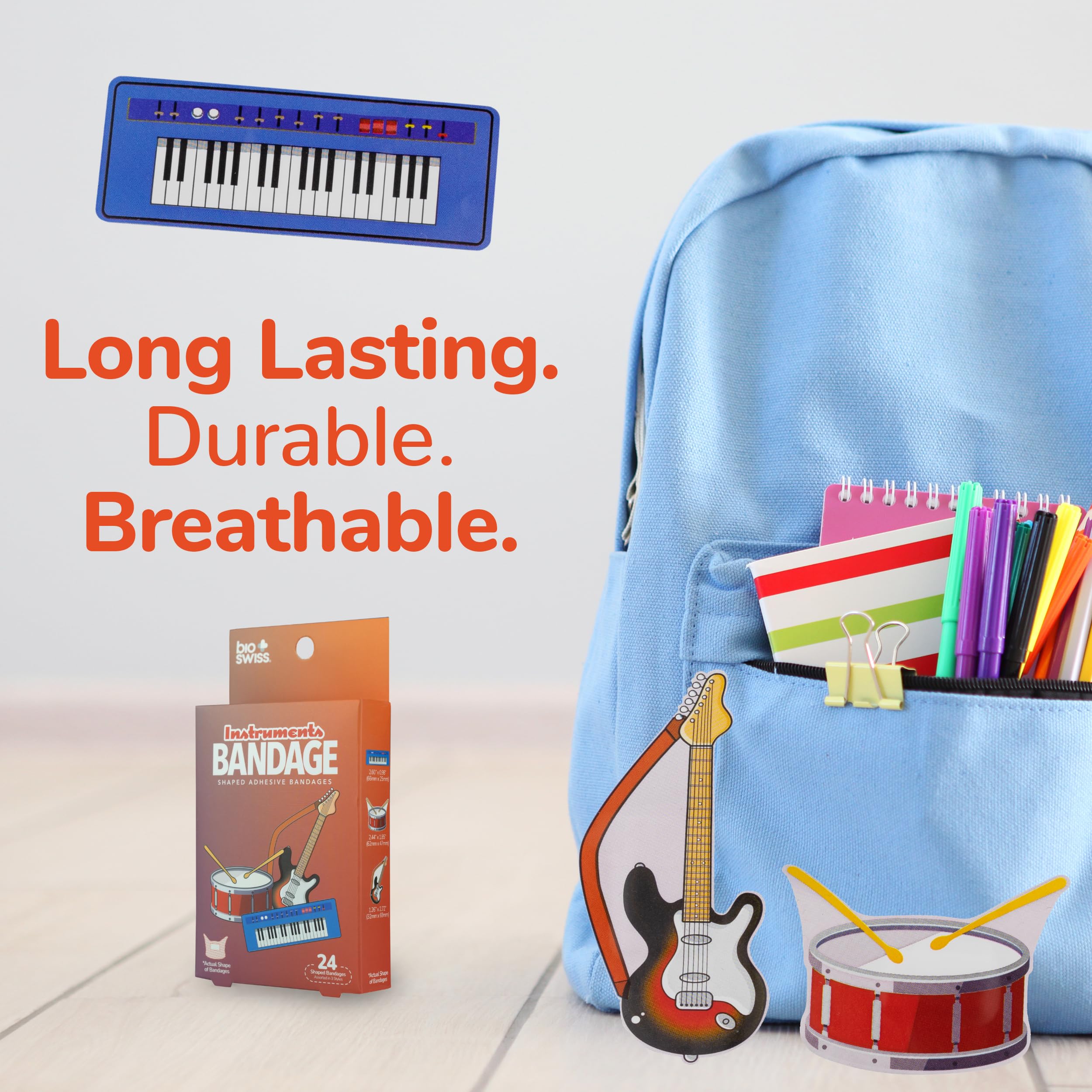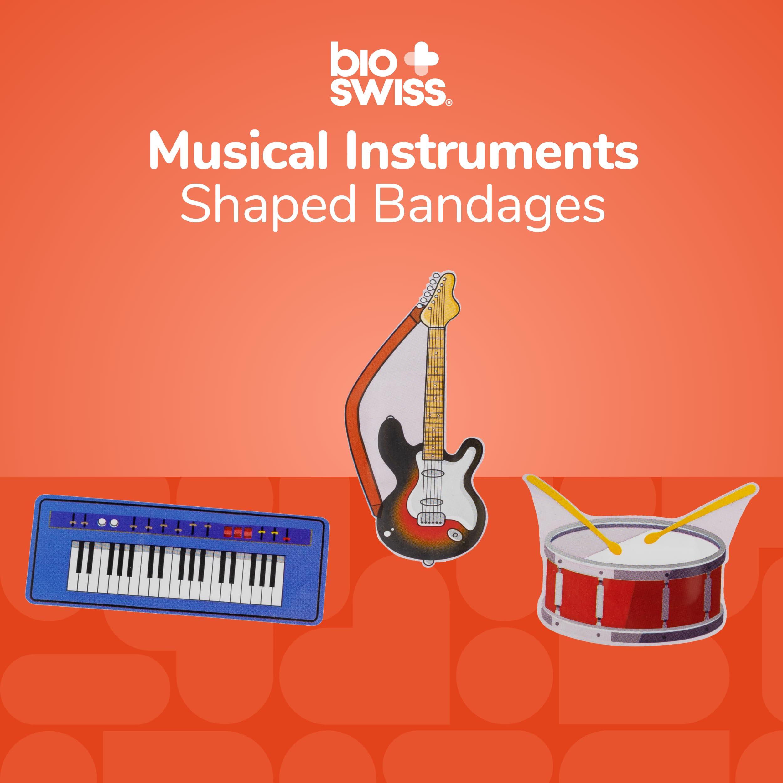 24 MUSIC INSTRUMENT BANDAGES: Musical instruments-shaped adhesive bandages pack helps protect cuts, scrapes, and minor wounds while making healing less stressful; bandages come in 3 assorted styles