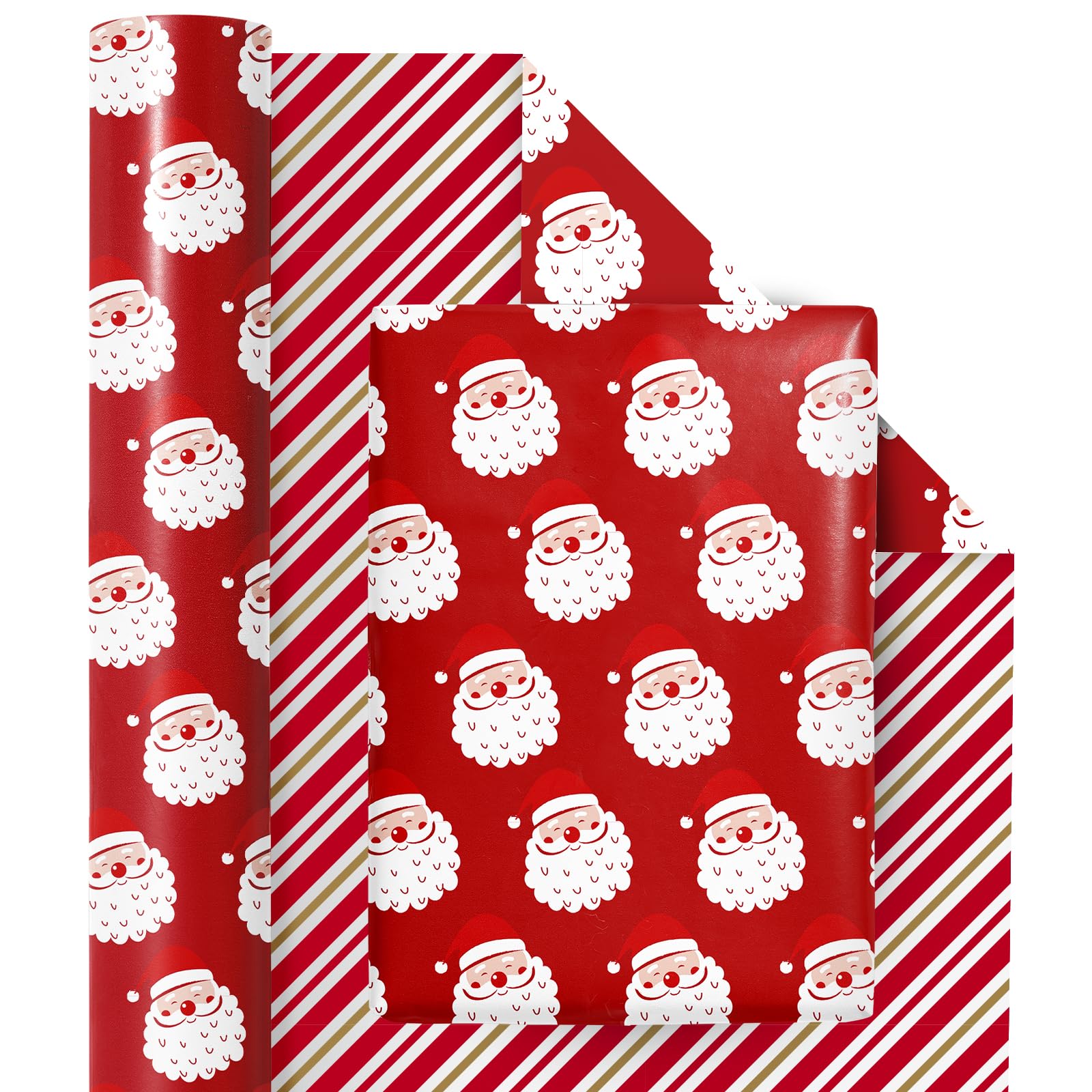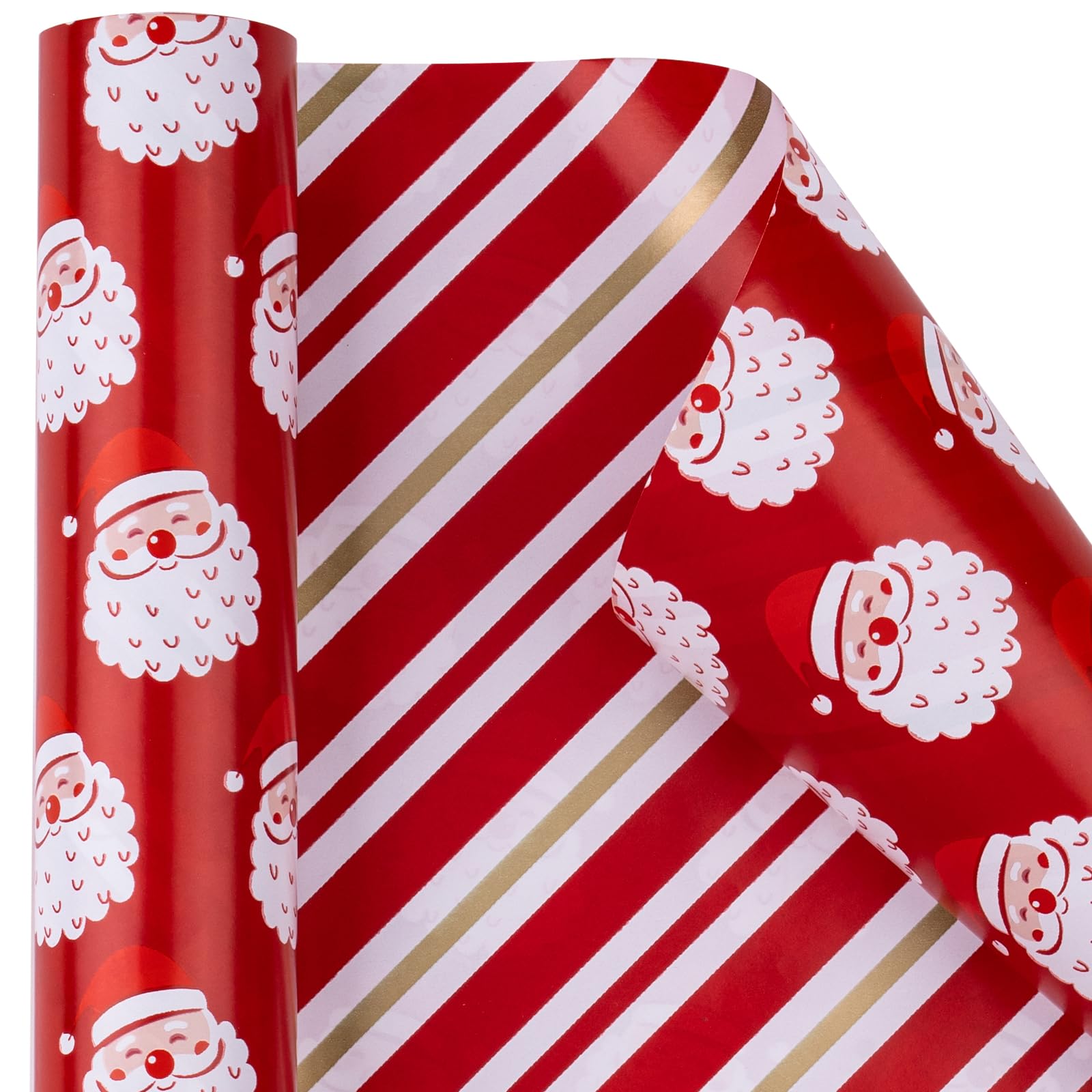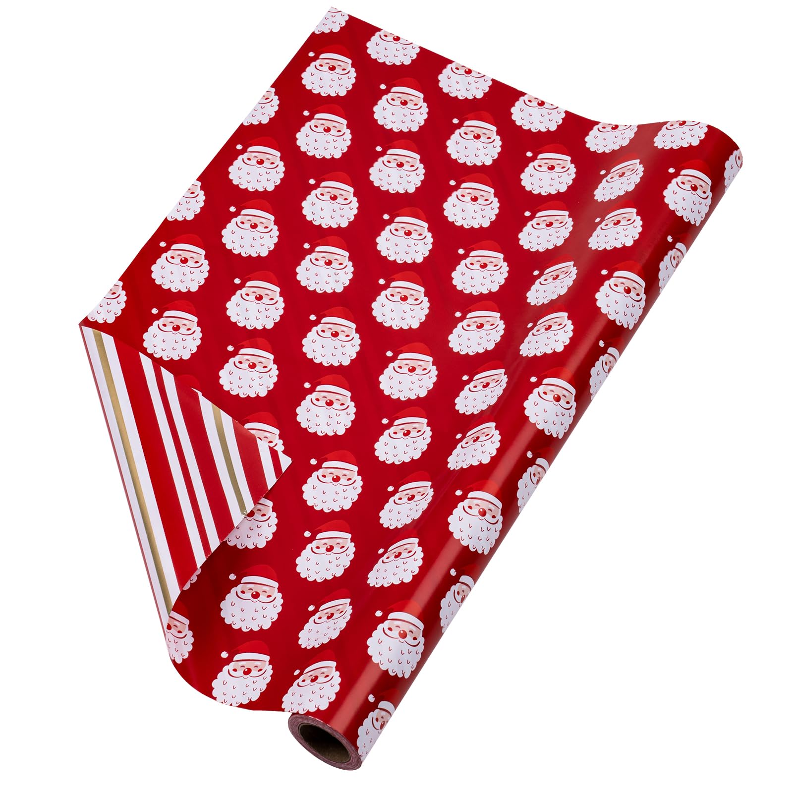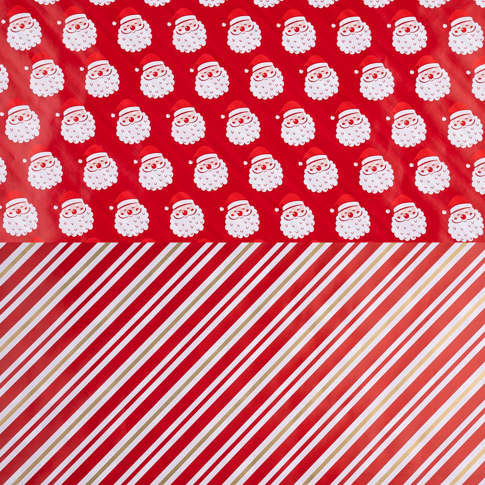 REVERSIBLE: Beautiful red santa claus printed on one red side, red and white stripes printed on the reverse. Two different designs make unique and varied gift presentations easy