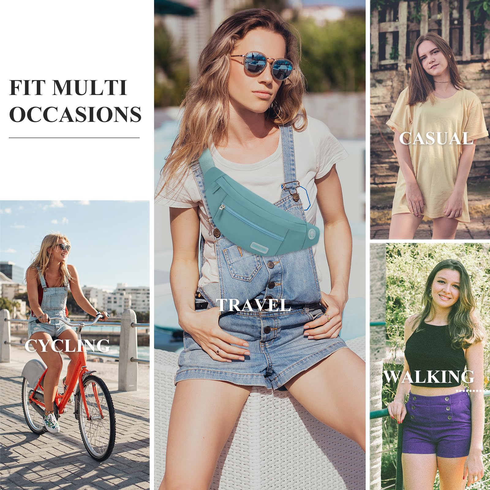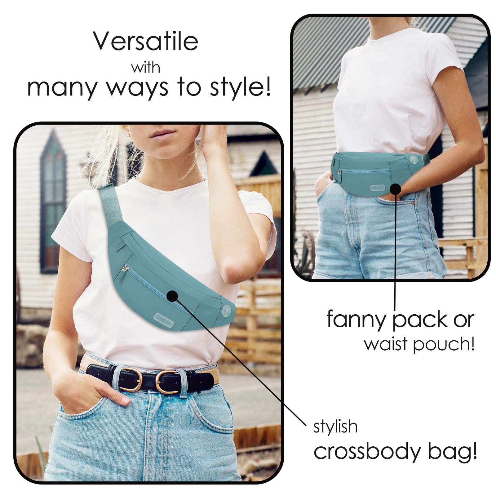 Changeable Style Fanny Pack,Many Ways to Wear — Since the comfortable long strap is widely adjustable for most waist size(20” - 50”).There are many ways to wear this fanny pack - You can wear it in front of your waist, as a belt bag,back on your hip, slant across your chest or over You shoulder.Perfect for various occasions.