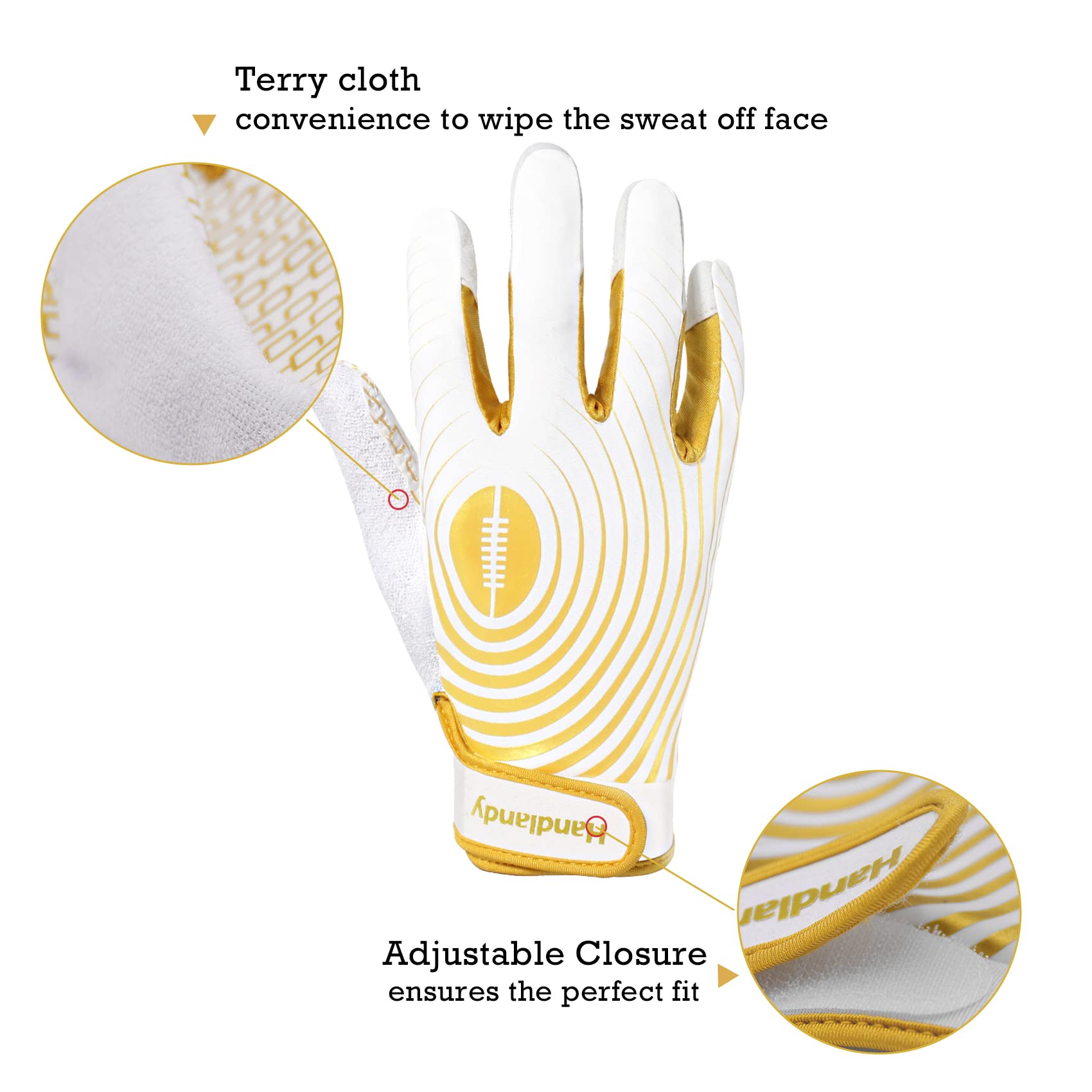 Amazing grip football gloves, keep the ball in hand : One piece tacky silicone palm design for an excellent grip to helps kids catch and hold on to footballs, durable and comfortable. These youth football gloves are suitable for teenagers, please refer to the scale table when purchasing!