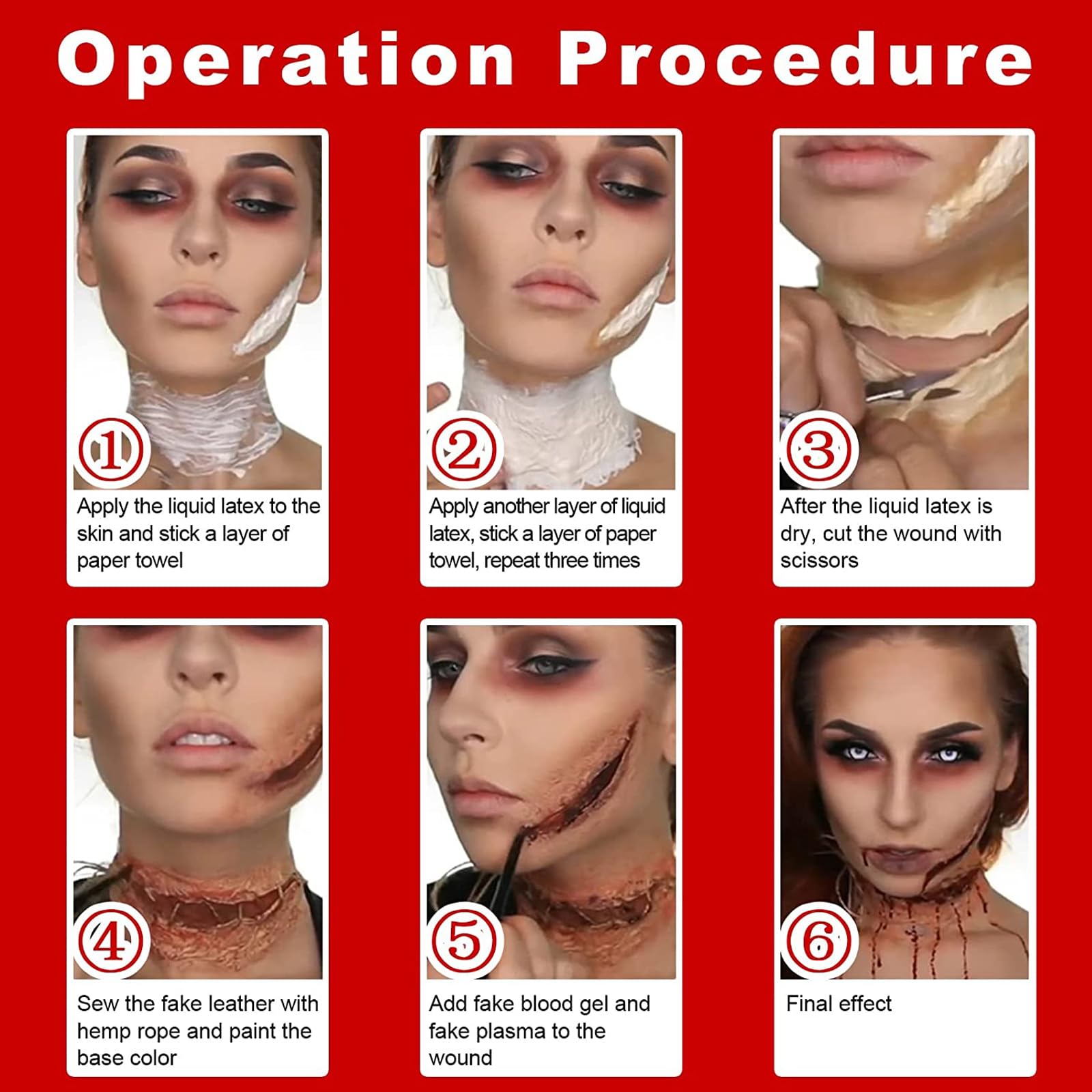 Easy to Use: Apply it with the sponge,create thin layer on the desired area and wait it to dry.1.To create textures like wrinkled effect, build up thin layers of liquid latex one by one.2.To create wound or scar effect,you need mixing latex with materials like cotton or tissue,and coloring with eyeshadow or face paint,then add the fake blood in.Easy to blend well and buildable,great for newbie.Notice:This liquid latex has strong smell(ammonia scented),smell will go away once it dried