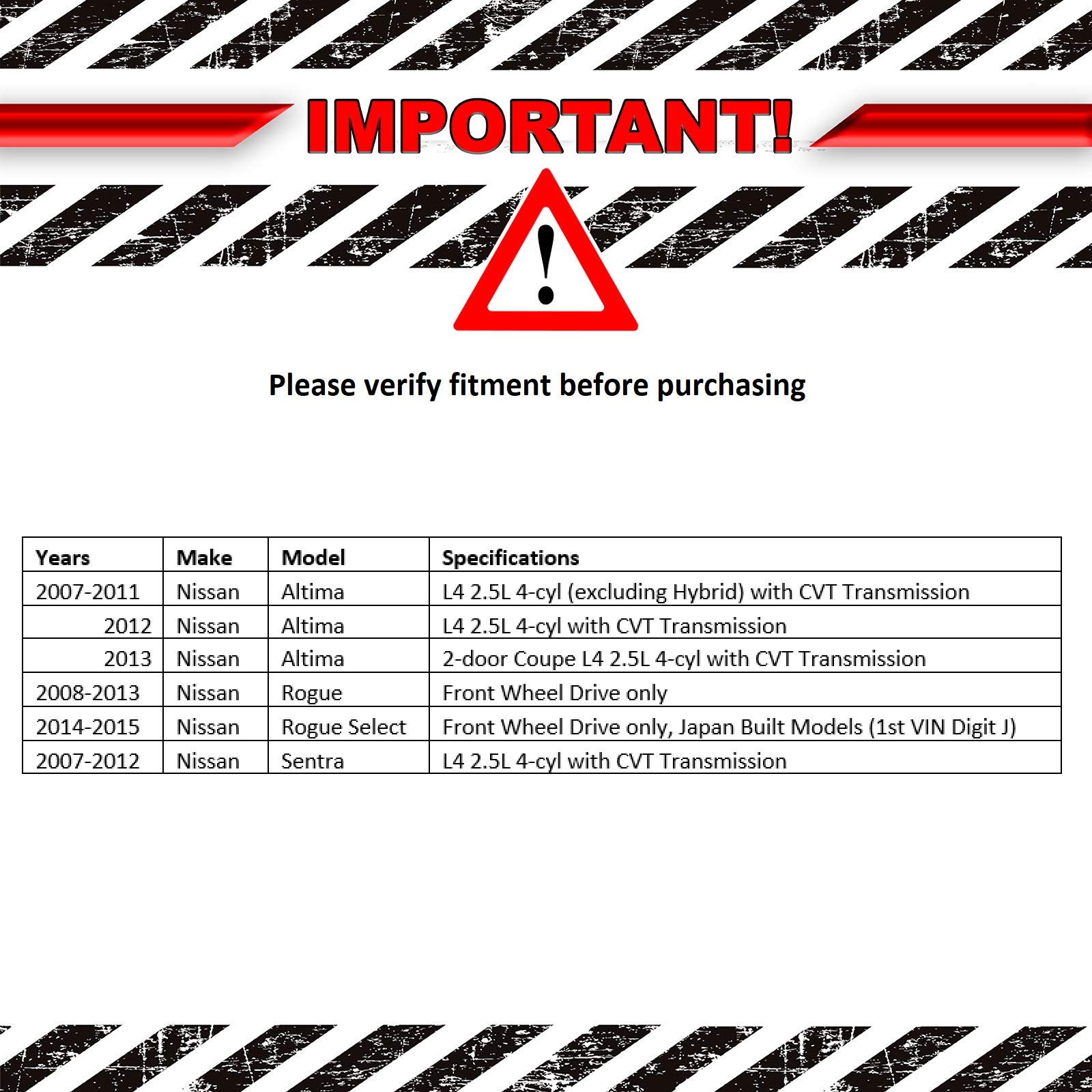 2 Piece CV Axle Assembly Set Kit Includes (1) Front Driver Side CV Axle Assembly (1) Front Passenger Side CV Axle Assembly Fitment Compatible with: 2008-13 Nissan Rogue Front Wheel Drive Front Driver & Passenger Side Compatible with: 2007-12 Nissan Sentra SE-R Front Driver & Passenger Side Compatible with: 2014-15 Nissan Rogue Select Front Wheel Drive Japan Built Models 1st VIN Digit J Front Driver & Passenger Side Product Attributes Quantity: 2 Piece Product Features 100% New: Manufactured to tighter tolerances for extended service life Neoprene Boots: Improved durability compared to stock material Moly Greased: Specifically-designed grease shield to reduce premature wear Application Specific Design: No modification Item Details TRQ CV (constant velocity) drive axles are manufactured using premium raw materials designed to restore original performance. TRQ CV drive axles are new, so there is no core charge with your TRQ purchase. TRQ-designed drive axles utilize neoprene boots, moly grease, stainless steel clamps, and heat-treated ball tracks to ensure extended service life. Each TRQ axle is application-specific so each spline and thread will mate properly for a seamless fit. All products are fit and road-tested in our Massachusetts R&D facility to ensure we deliver on our promise of Trusted Reliable Quality. Reference Numbers 39100ET80C 39100JA010 39100JG02C 39101ET80C 39101JA010 39101JG02C 447-50477R 447-50479L 66-6262 66-6263 66-6264 666262 666263 NCV53911 NCV53912 NI8227