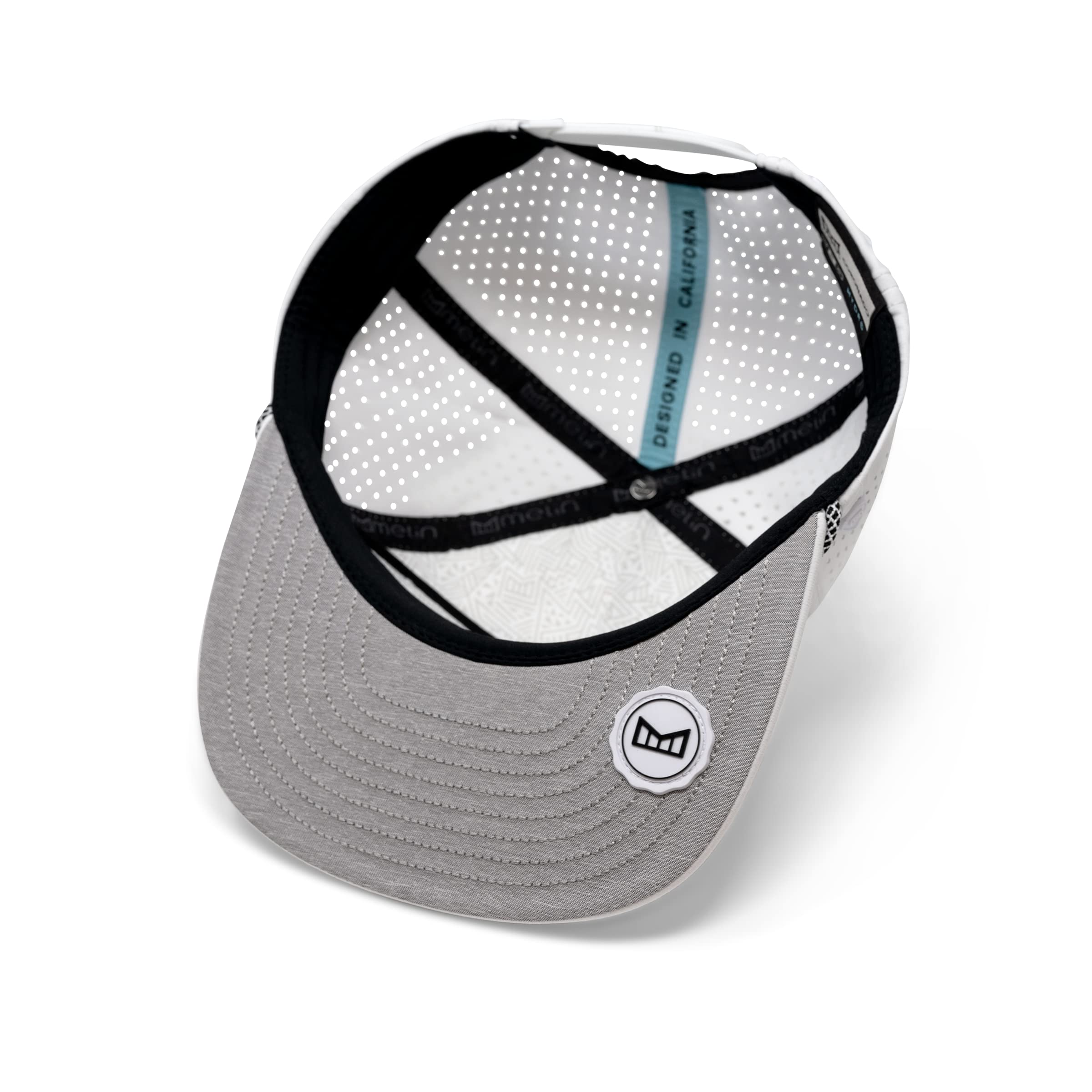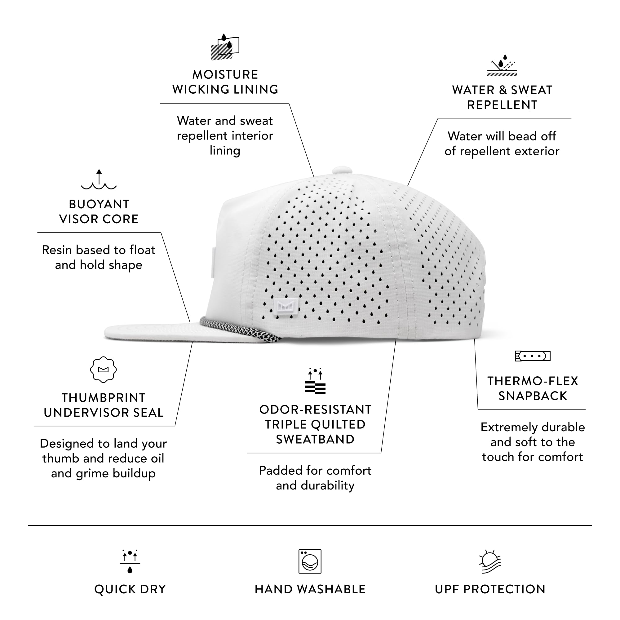 PERFORMANCE SNAPBACK HAT: Exterior crown has hydrophobic crown panels, laser-perforated side & rear panels for breathability, and custom soft touch snapback closure. Honeycomb Visor is designed for weight reduction and packability
