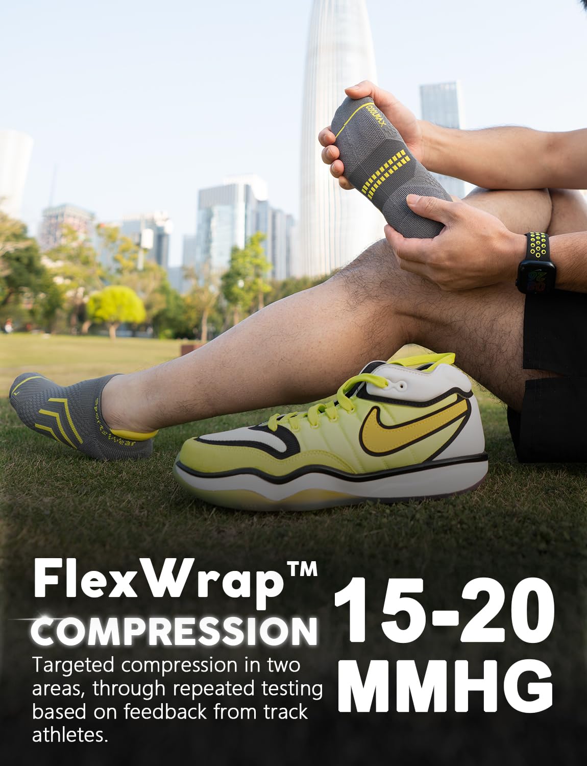 【Flexwrap Compression】: With 15-20mmHg targeted compression for the arch and calf, these socks reduce muscle vibration and fatigue, enhancing performance during your runs, basketball games, tennis matches, golf outings, hiking adventures, and cycling trips. Enjoy quicker recovery times, making them ideal for athletes in any sport.