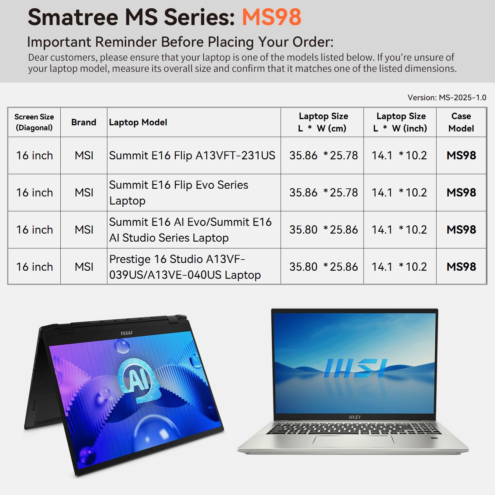Compatibility: designed to perfectly fit for 16 inch MSI Summit E16 Flip A13VFT-231US Laptop; 16 inch MSI Summit E16 Flip Evo Series Laptop; 16 inch MSI Summit E16 AI Evo/Summit E16 AI Studio Series Laptop; 16 inch MSI Prestige 16 Studio A13VF-039US/A13VE-040US Laptop