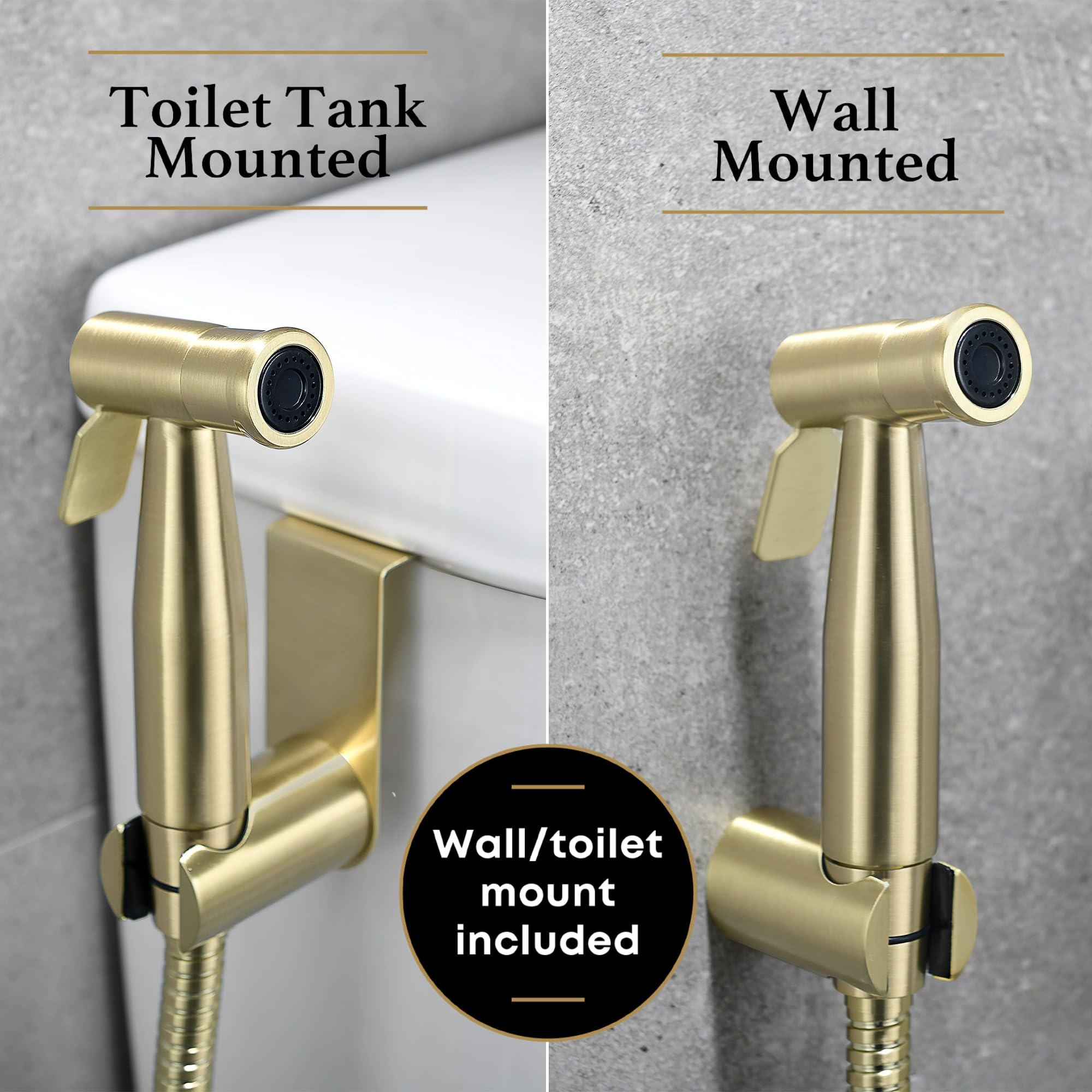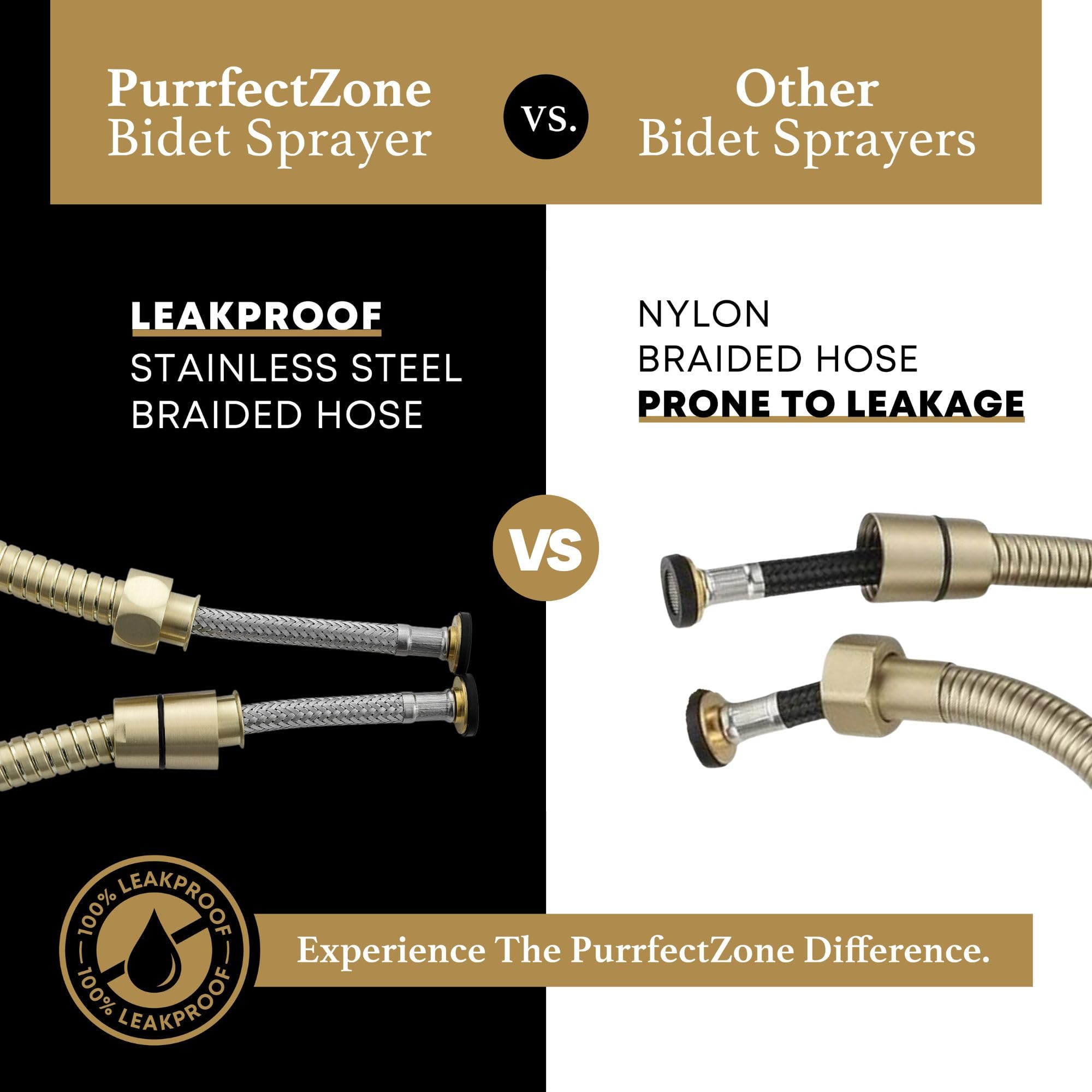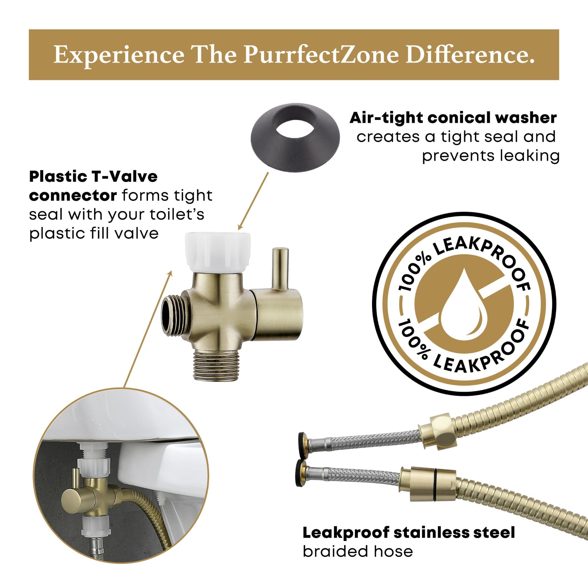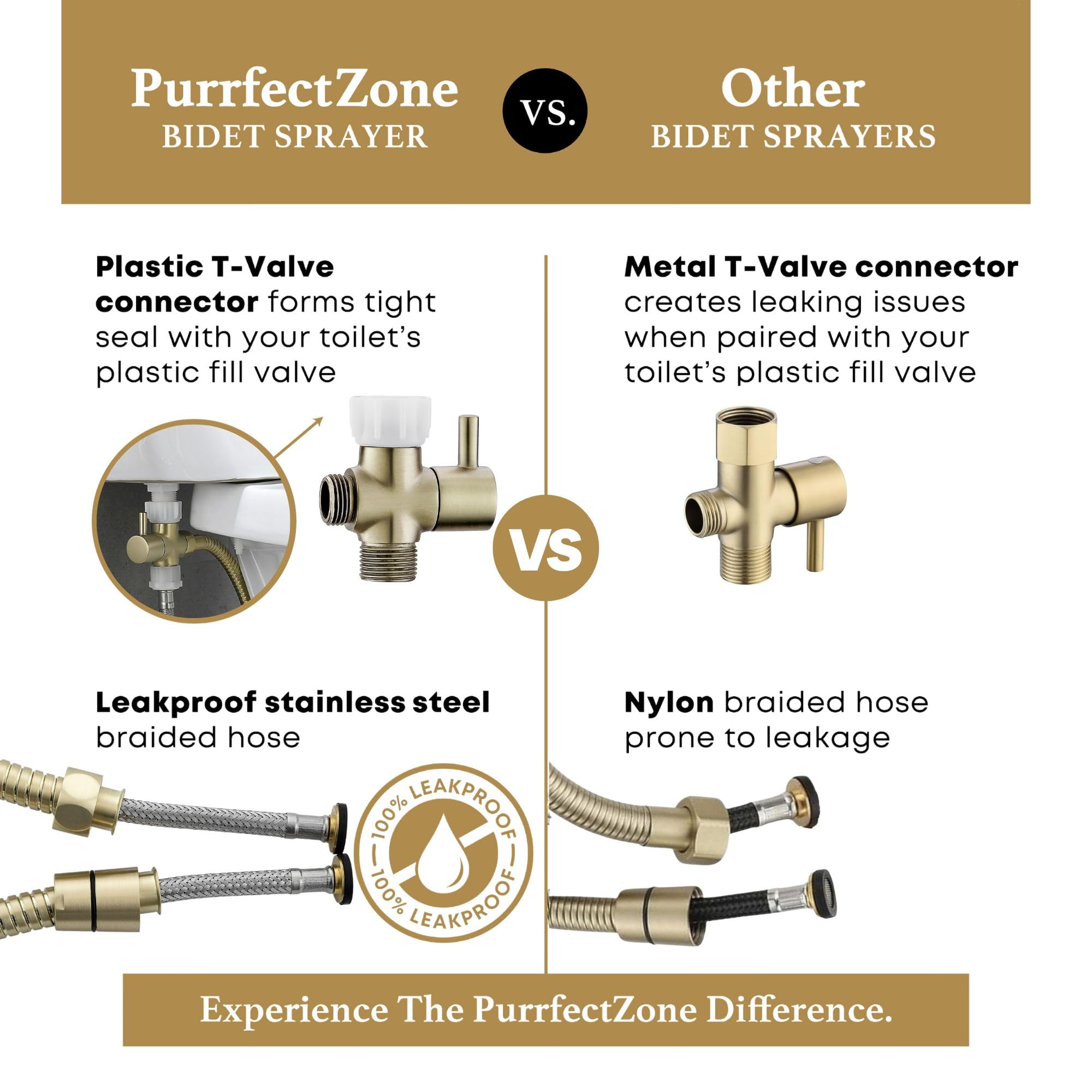Includes 2 complete sets of the Purrfectzone Brushed Gold Bidet Sprayer for Toilet made of high-quality 304 Stainless Steel, your handheld bidet hose sprayer is backed by our commitment to your satisfaction